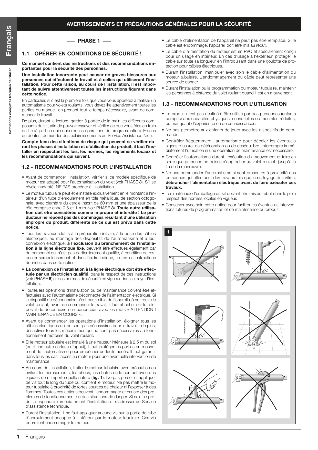Le moteur tubulaire peut être installé exclusivement en le montant à l'in- térieur d'un tube d'enroulement en tôle métallique, de section octogo- nale, avec diamètre du cercle inscrit de 60 mm et une épaisseur de la tôle comprise entre 0,6 et 1 mm (voir PHASE 3). Toute autre utilisa- tion doit être considérée comme impropre et interdite ! Le pro- ducteur ne répond pas des dommages résultant d’une utilisation impropre du produit, différente de ce qui est prévu dans cette notice.
