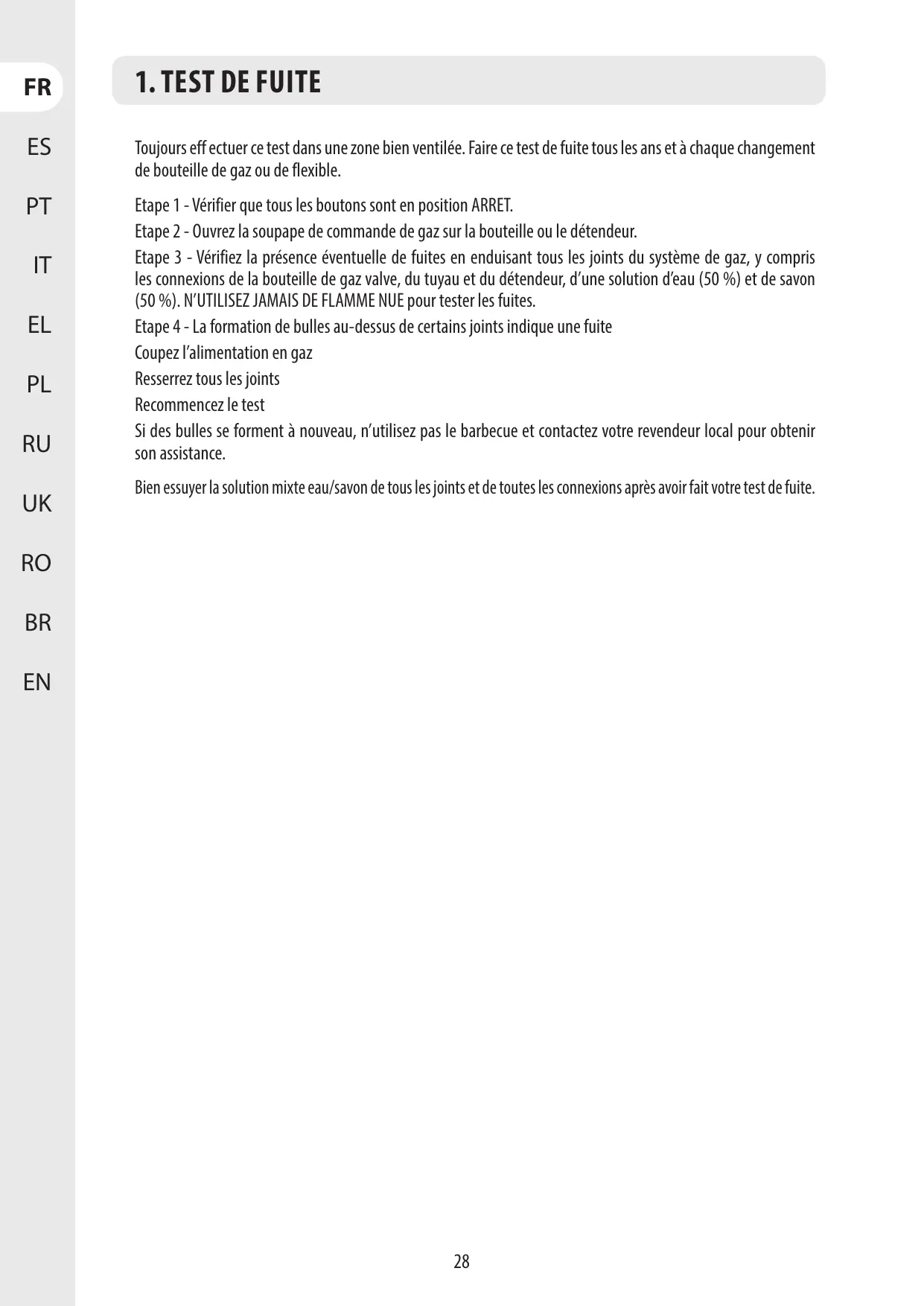 - Avant d'utiliser votre barbecue faîtes un test de fuite. C'est le seul moyen fiable de détecter une fuite de gaz sur les joints ou les connexions après le montage.