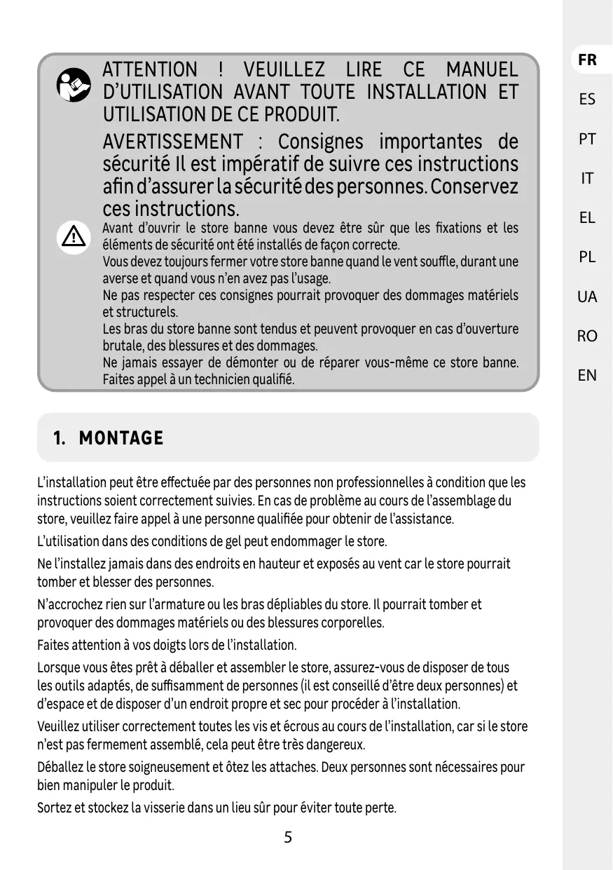 VAN Avant d'ouvrir Le store banne vous devez être sûr que les fixations et les éléments de sécurité ont été installés de façon correcte. Vous devez toujours fermer votre store banne quand Le vent souffle, durant une averse et quand vous n’en avez pas l'usage. Ne pas respecter ces consignes pourrait provoquer des dommages matériels et structurels. Les bras du store banne sont tendus et peuvent provoquer en cas d'ouverture brutale, des blessures et des dommages. Ne jamais essayer de démonter ou de réparer vous-même ce store banne. Faites appel à un technicien qualifié.