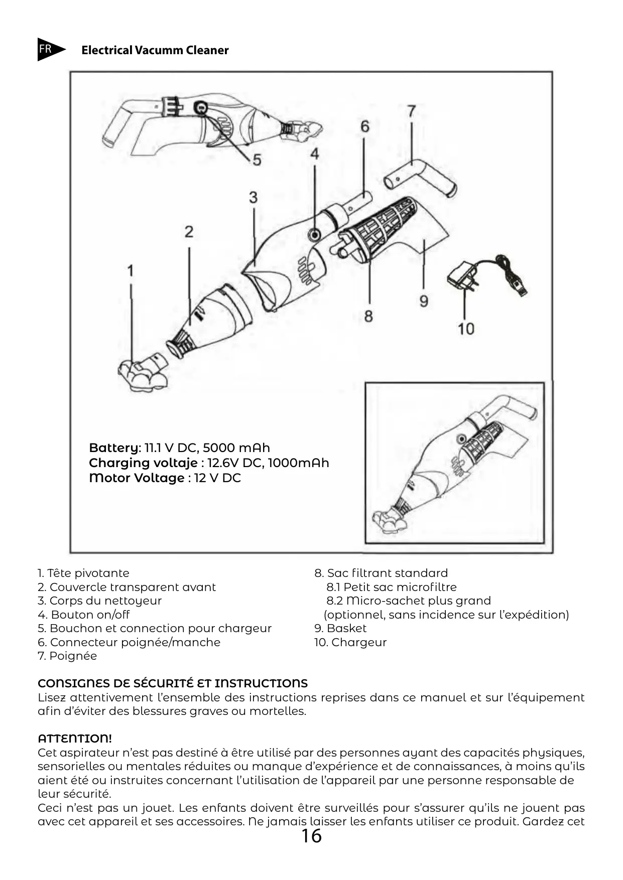 Mise en garde: utiliser un chargeur erronée peut endommager la batterie ou Le nettoyeur et annuler la