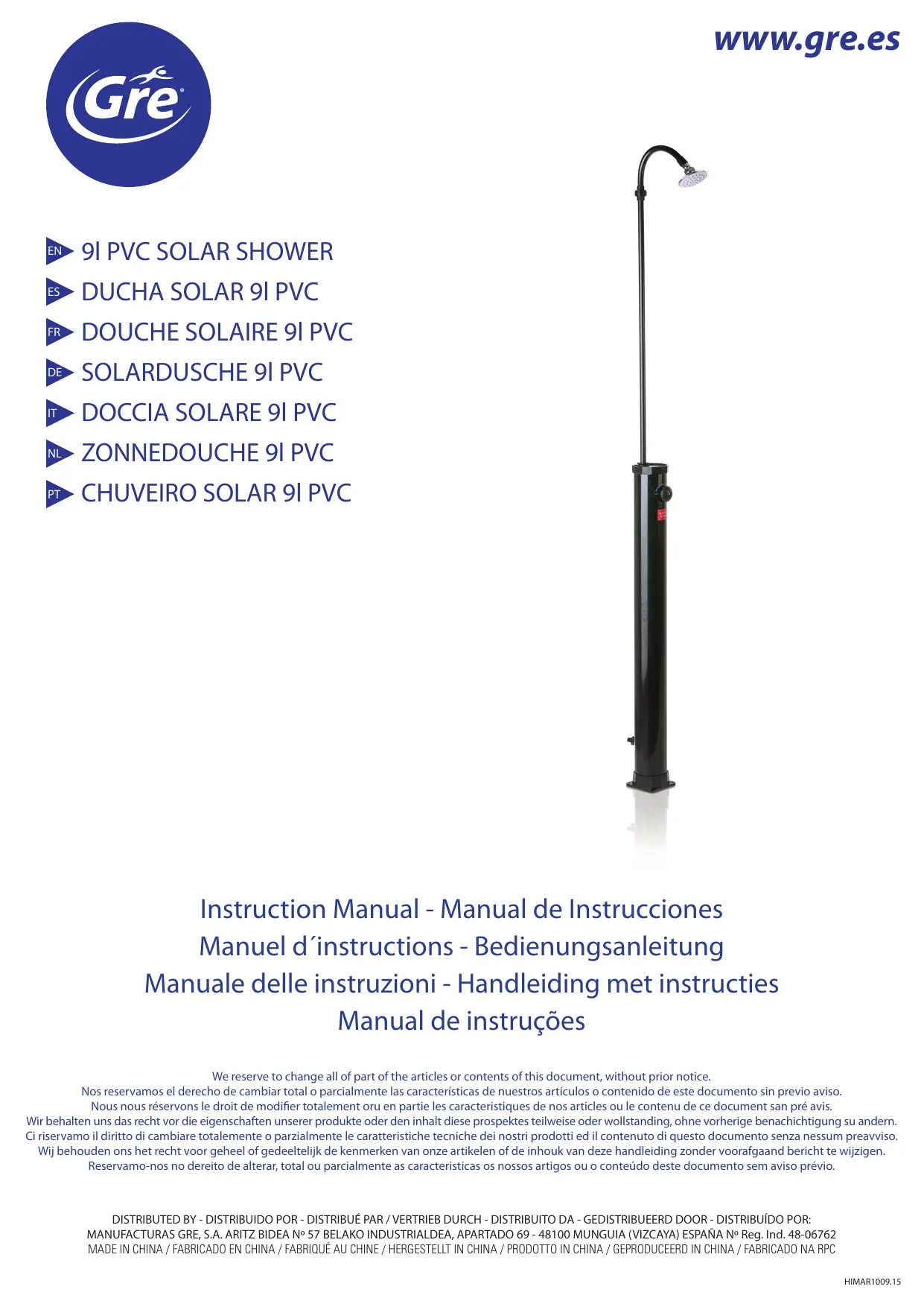 DOUCHE COURBé PVC SOLAIRE PVC, 9 L - Douche solaire GRE - Notice d'utilisation et mode d'emploi gratuit