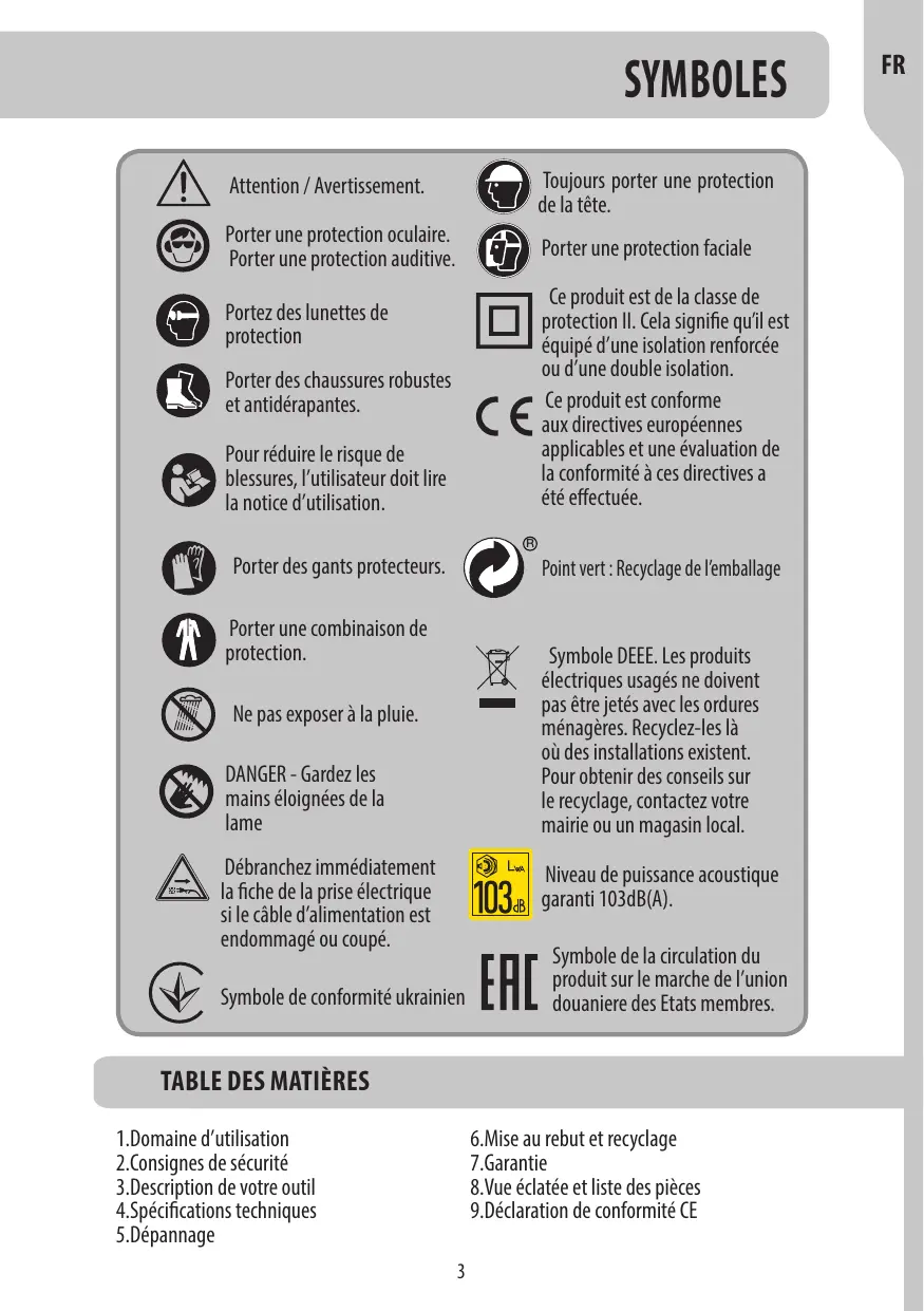 | Sécurité | Port de lunettes de protection et de gants recommandé, utilisation de protections auditives conseillée |