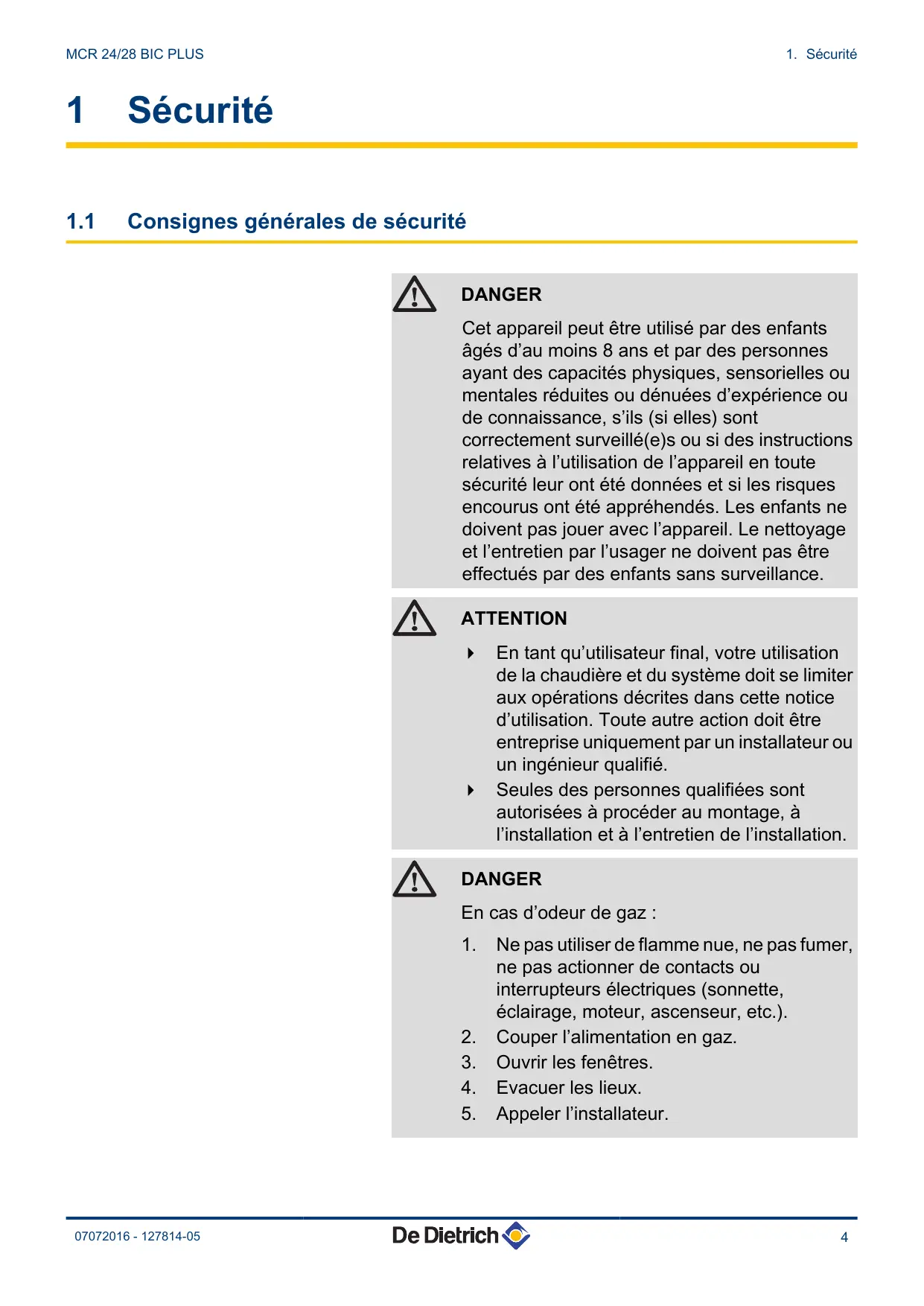 DANGER Cet appareil peut être utilisé par des enfants âgés d’au moins 8 ans et par des personnes ayant des capacités physiques, sensorielles ou mentales réduites ou dénuées d'expérience ou de connaissance, s'ils (si elles) sont correctement surveillé(e)s ou si des instructions relatives à l’utilisation de l’appareil en toute sécurité leur ont été données et si les risques encourus ont été appréhendés. Les enfants ne doivent pas jouer avec l'appareil. Le nettoyage et l'entretien par l'usager ne doivent pas être effectués par des enfants sans surveillance. ATTENTION > En tant qu'utilisateur final, votre utilisation de la chaudière et du système doit se limiter aux opérations décrites dans cette notice d'utilisation. Toute autre action doit être entreprise uniquement par un installateur ou un ingénieur qualifié. > Seules des personnes qualifiées sont autorisées à procéder au montage, à l'installation et à l'entretien de l'installation. DANGER En cas d’odeur de gaz :