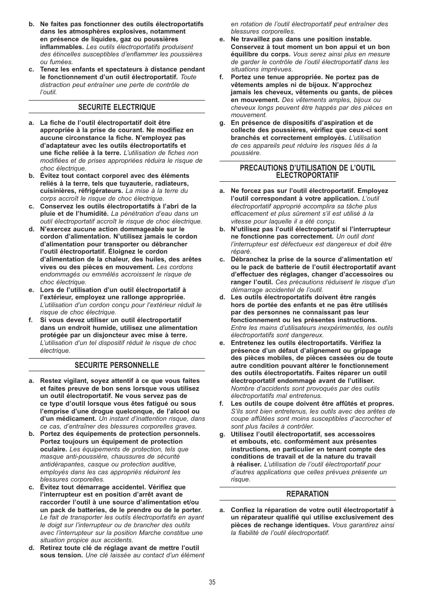 ELECTROPORTATIF Ne forcez pas sur l'outil électroportatif. Employez l'outil correspondant à votre application. L'outil électroportatif approprié accomplira sa tâche plus efficacement et plus sûrement s'il est utlisé à la vitesse pour laquelle il a été conçu. N'utilisez pas l'outil électroportatif si l'interrupteur ne fonctionne pas correctement. Un outi! dont l'interrupteur est défectueux est dangereux et doit être réparé. Débranchez la prise de la source d'alimentation et/ ou le pack de batterie de l'outil électroport d'effectuer des réglages, changer d'access ranger l'outil. Ces précautions réduisent le risque d'un démarrage accidentel de l'outil. Les outils électroportatifs doivent être rangés hors de portée des enfants et ne pas être ut par des personnes ne connaissant pas leur fonctionnement ou les présentes instructions. Entre les mains d'utilisateurs inexpérimentés, les outils électroportatifs sont dangereux. Entretenez les outils électroportatifs. Ve présence d'un défaut d’alignement ou gj des pièces mobiles, de pièces cassées ou de toute autre condition pouvant altérer le fonctionnement des outils électroportatifs. Faites réparer un outil électroportatif endommagé avant de l'u Nombre d'accidents sont provoqués par des outils électroportatifs mal entretenus. Les outils de coupe doivent être affütés et propres. S'ils sont bien entretenus, les outils avec des arêtes de coupe affütées sont moins susceptibles d'accrocher et sont plus faciles à contrôler. Utilisez l'outil électroportatif, ses accessoires et embouts, etc. conformément aux présentes ns, en particulier en tenant compte des à réaliser. L'utlisation de l'outil électroportatif pour d'autres applications que celles prévues présente un risque. REPARATION Confiez la réparation de votre outil électroportatif à un réparateur qualifié qui utilise exclusivement des pièces de rechange identiques. Vous garantirez ainsi la fiabilité de l'outil électroportatif.