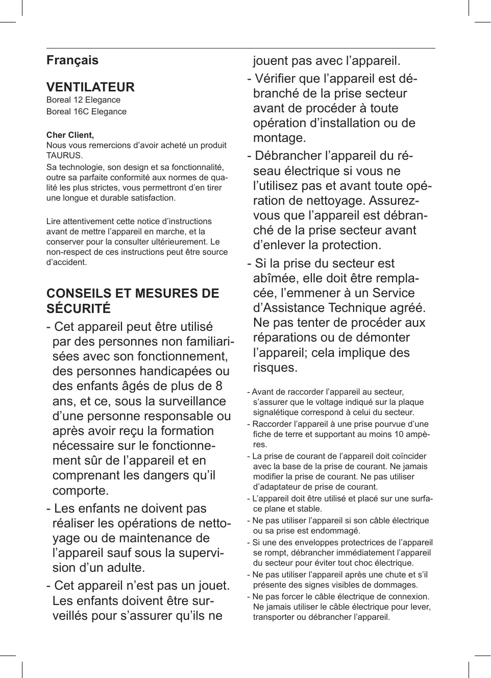 Français VENTILATEUR Boreal 12 Elegance Boreal 16C Elegance Cher Client, Nous vous remercions d'avoir acheté un produit TAURUS. Sa technologie, son design et sa fonctionnalité, outre sa parfaite conformité aux normes de qua- lité les plus strictes, vous permettront d'en tirer une longue et durable satisfaction. Lire attentivement cette notice d'instructions avant de mettre l'appareil en marche, et la conserver pour la consulter ultérieurement. Le non-respect de ces instructions peut être source d'accident.