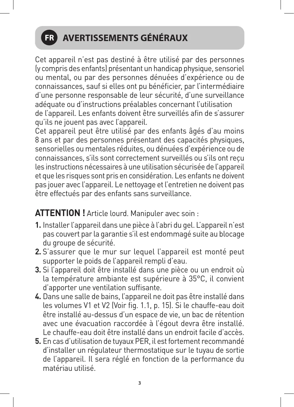 À AvERTISSEMENTS GÉNÉRAUX Cet appareil n'est pas destiné à être utilisé par des personnes {y compris des enfants) présentant un handicap physique, sensoriel ou mental, ou par des personnes dénuées d'expérience ou de connaissances, sauf si elles ont pu bénéficier, par l'intermédiaire d'une personne responsable de leur sécurité, d'une surveillance adéquate ou d'instructions préalables concernant l'utilisation de l'appareil. Les enfants doivent être surveillés afin de s'assurer qu'ils ne jouent pas avec l'appareil. Cet appareil peut être utilisé par des enfants âgés d'au moins 8 ans et par des personnes présentant des capacités physiques, sensorielles ou mentales réduites, ou dénuées d'expérience ou de connaissances, s'ils sont correctement surveillés ou s'ils ont recu les instructions nécessaires à une utilisation sécurisée de l'appareil et que les risques sont pris en considération. Les enfants ne doivent pas jouer avec l'appareil. Le nettoyage et l'entretien ne doivent pas être effectués par des enfants sans surveillance. ATTENTION !'Article lourd. Manipuler avec soin :
