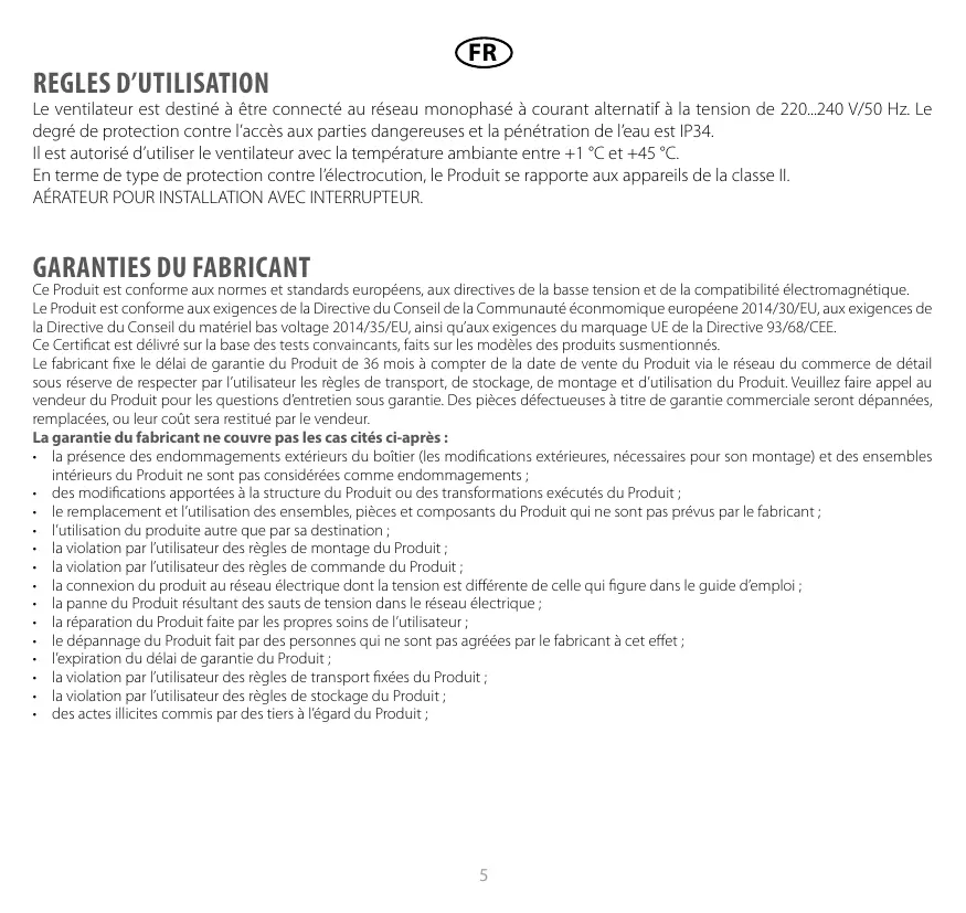 OPÉRATIONS DE MISE AU POINT. L'AIR VÉHICULÉ AU SEIN DU RÉSEAU NE DOIT PAS CONTENIR DE POUSSIÈRES, D'IMPURETÉS SOLIDES, NI DE MATIÈRES VISQUEUSES OU FIBREUSES. IL EST INTERDIT D'UTILISER LE PRODUIT DANS UN MILIEU INFLAMMABLE OU DÉFLAGRANT QUI CONTIENT, PAR EXEMPLE, LES VAPEURS D'ALCOOL, D'ESSENCE, D'INSECTICYDES. N'OBTUREZ PAS ET N'ENCOMBREZ PAS LES ORIFICES D'ASPIRATION ET DE SORTIE DU PRODUIT, AFIN DE NE PAS OBSTRUER LE FLUX D'AIR OPTIMU REGLES D'UTILISATION Le ventilateur est destiné à être connecté au réseau monophasé à courant alternatif à la tension de 220..240 V/50 Hz. Le degré de protection contre l'accès aux parties dangereuses et la pénétration de l'eau est IP34.