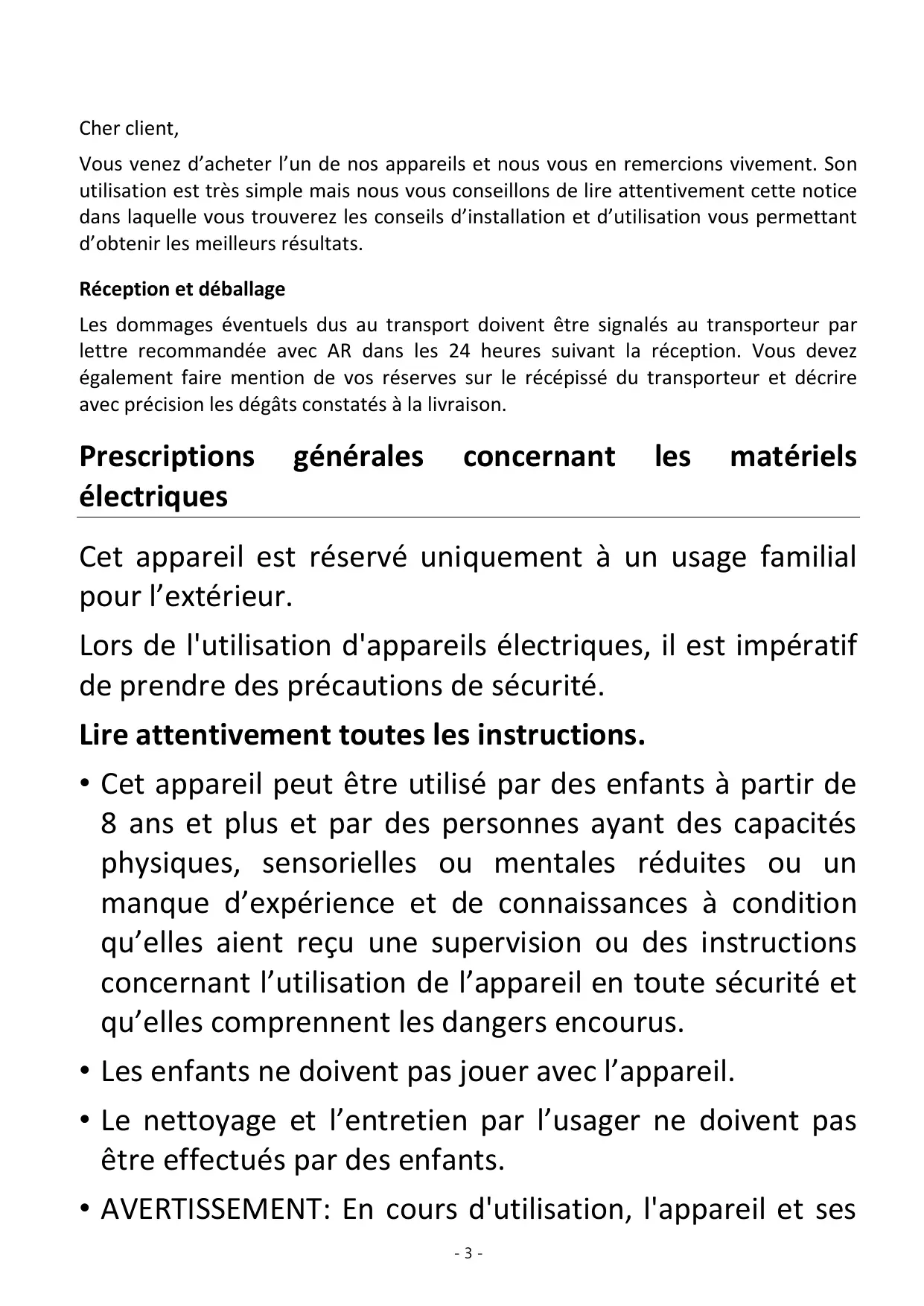 Cet appareil est réservé uniquement à un usage familial pour l'extérieur.