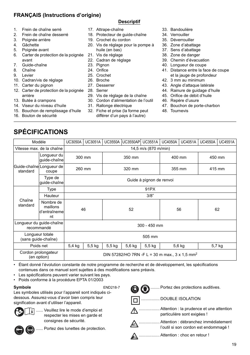 10. CadranWvis de réglage 26. Broche 42. 3 mm au minimum 11. Carter du pignon 27. Desserrer 43. Angle d'attaque latérale 12. Carter de protection de la poignée 28. Serrer 44. Rainure de guidage d'huile arrière 29. Vis de réglage de la chaîne 45. Orifice de débit d'huile 13. Butée à crampons 30. Cordon d'alimentation de l'outil 46. Repère d'usure 14. Viseur du niveau d'huile 31. Rallonge électrique 47. Bouchon de porte-charbon 15. Bouchon de remplissage d'huile 32. Fiche et prise (la forme peut 48. Tournevis 16. Bouton de sécurité différer d'un pays à l'autre) SPÉCIFICATIONS Modèle uC3050A | UC3051A | UC3550A [uC3550aP] UC3551A [ UC4050A | UC4051A | UC4550A [ UCASS1A Vitesse max. de la chaîne 14,5 ms (870 m/min) Longueur du| "300 mm 350 mm 400 mm 450 mm jguide-chaînel (Guide-chaine| Longueur de Standard | coupe 260 mm 320 mm 355 mm 415 mm Type de uide-chainel Guide à pignon de renvoi Type SIPX Hauteur ET Chaîne sandar | “als. 46 52 56 62 (d'entraîneme nt Longueur du guide-chaîne recommandé 300-450 mm Longueur totale Portez des lunettes de protection.