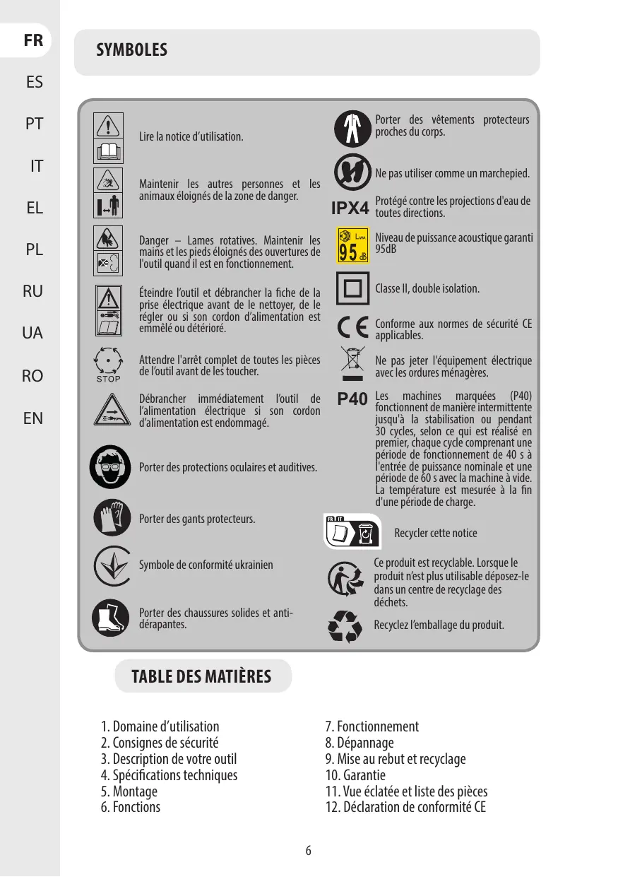 Les pannes résultant d'une usure normale ou d'une utilisation inappropriée du produit ne sont pas couvertes par la garantie. Cela indut, entre autres, les interrupteus, le disjoncteur de sécurité etles moteurs en cas d'usure.