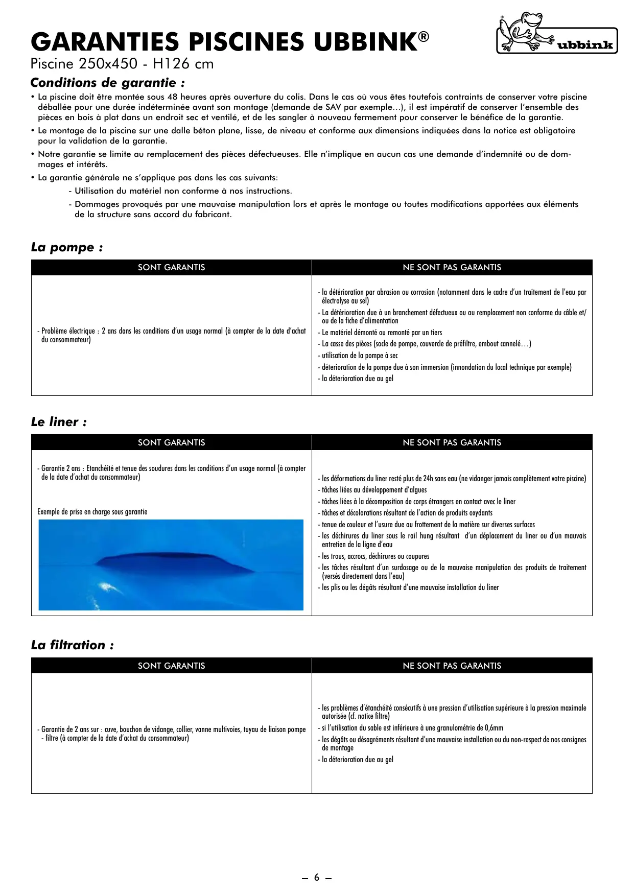 Piscine 250x450 - H126 cm Conditions de garantie : + La piscine doit être montée sous 48 heures après ouverture du colis. Dans le cas où vous êtes toutefois contraints de conserver votre piscine déballée pour une durée indéterminée avant son montage (demande de SAV par exemple….), il est impératif de conserver l'ensemble des pièces en bois à plat dans un endroit sec et ventilé, et de les sangler à nouveau fermement pour conserver le bénéfice de la garantie. + Le montage de la piscine sur une dalle béton plane, lisse, de niveau et conforme aux dimensions indiquées dans la notice est obligatoire pour la validation de la garantie + Notre garantie se limite au remplacement des pièces défectueuses. Elle n'implique en aucun cas une demande d'indemnité ou de dom- mages et intérêts. + La garantie générale ne s'applique pas dans les cas suivants: - Utilisation du matériel non conforme à nos instructions. - Dommages provoqués par une mauvaise manipulation lors et après le montage ou toutes modifications apportées aux éléments de la structure sans accord du fabricant. La pompe : SONT GARANTIS - Problème électrique : 2 ans dans les conditions d'un usage normal [à compter de la date d'achat du consommateur)