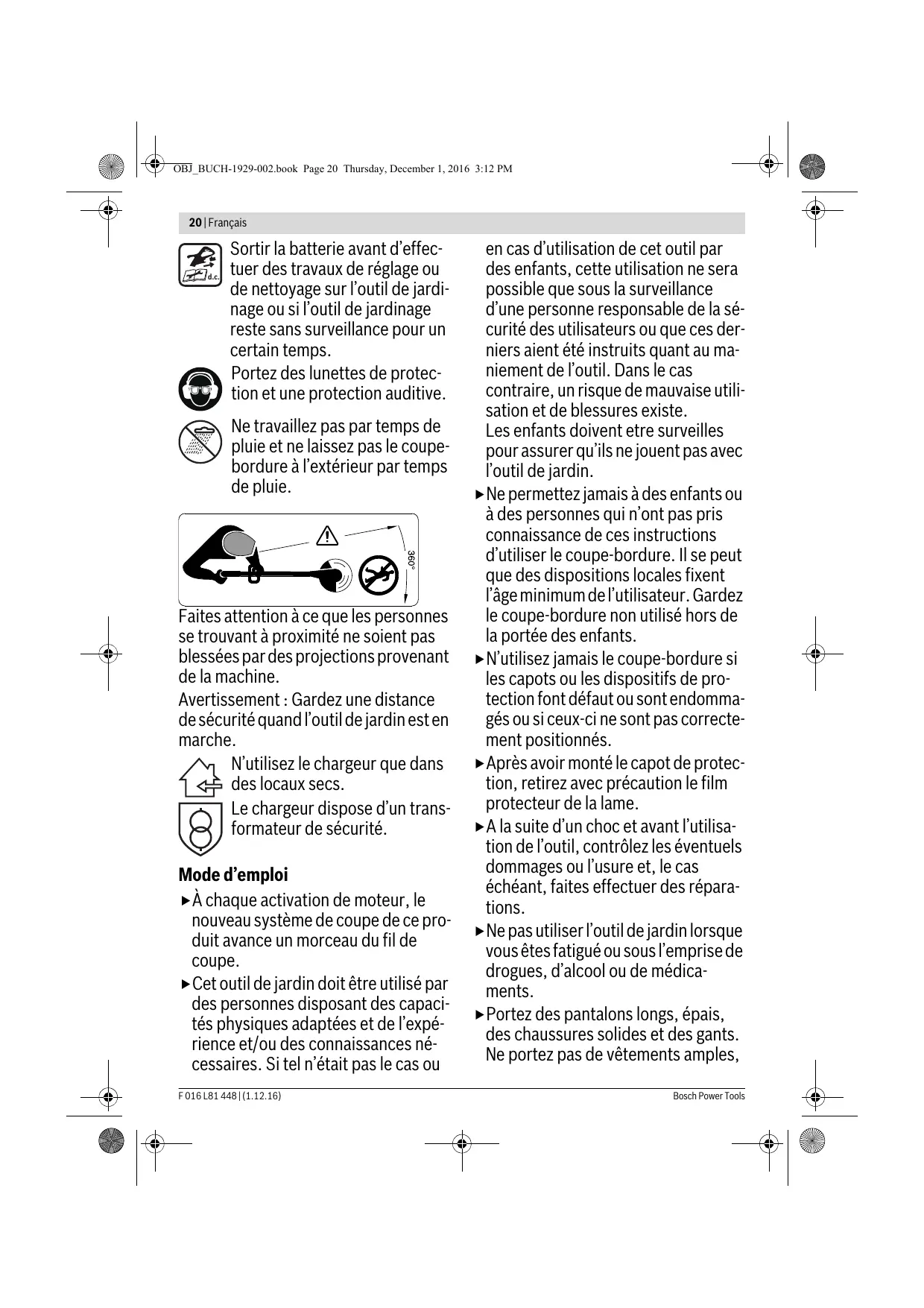 Faites attention à ce que les personnes se trouvant à proximité ne soient pas blessées par des projections provenant de la machine. Avertissement : Gardez une distance de sécurité quand l'outil de jardin esten marche. N'utilisez le chargeur que dans des locaux secs.