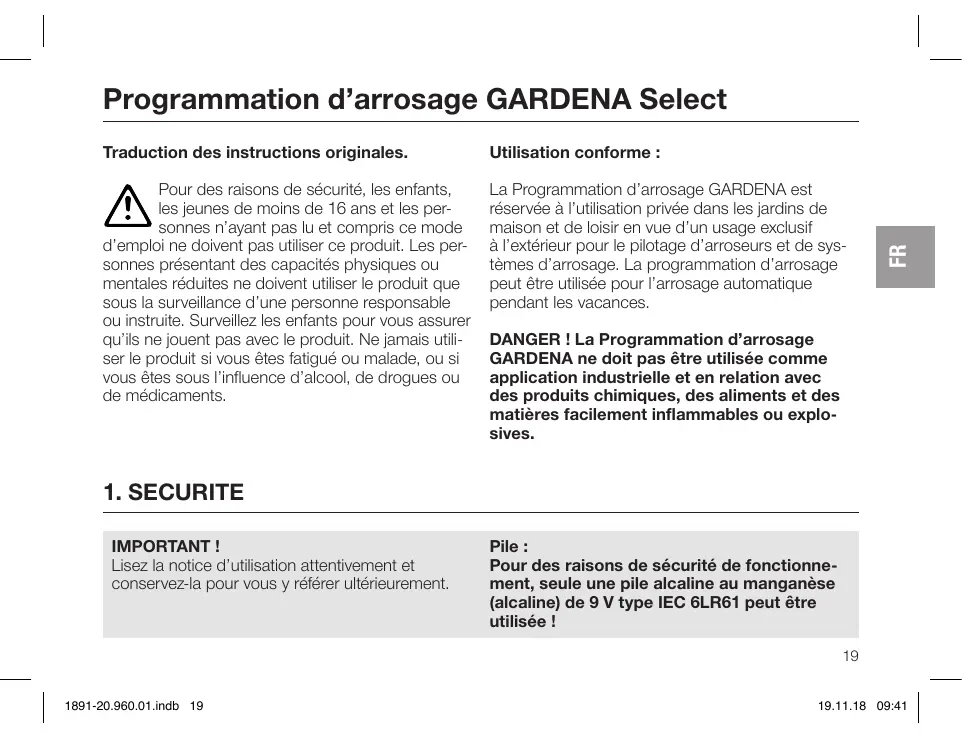 Select - 1891 - Programmateur piles GARDENA - Notice d'utilisation et mode d'emploi gratuit