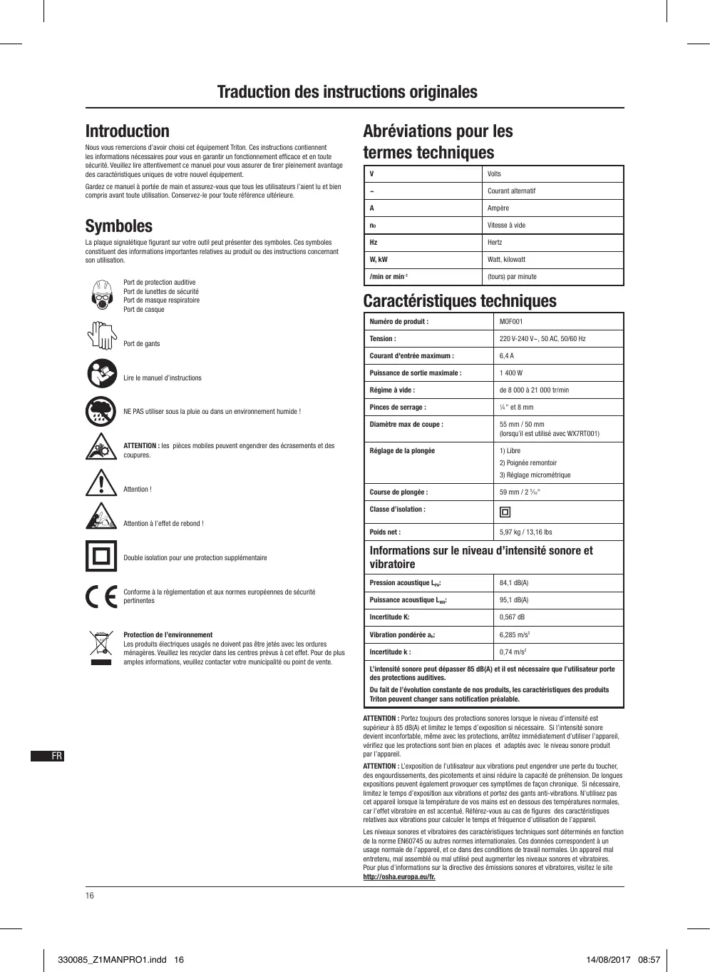 MOF 001 - 1400 W - Défonceuse TRITON - Notice d'utilisation et mode d'emploi gratuit