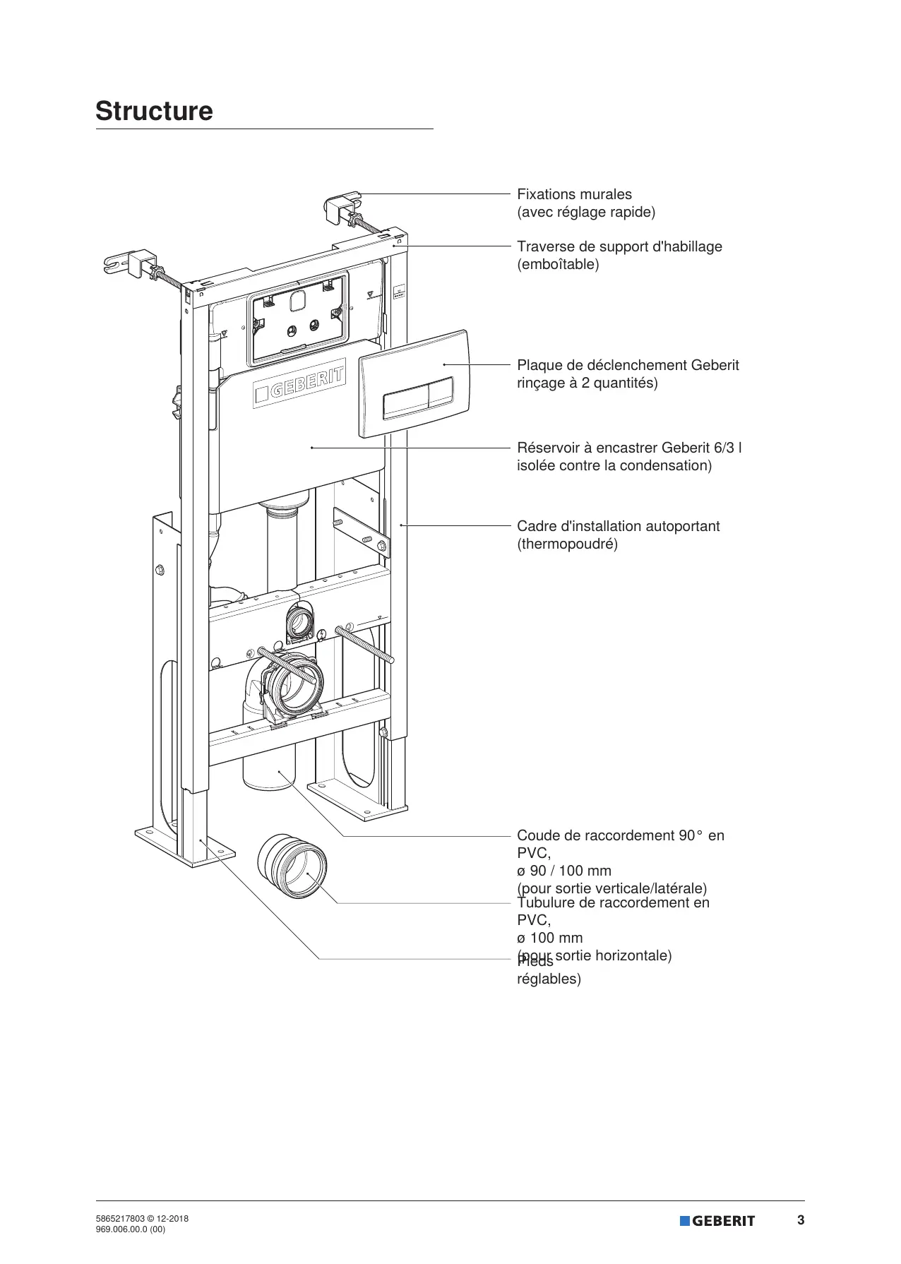 Structure Fixations murales (avec réglage rapide) Traverse de support d'habillage (emboîtable) Plaque de déclenchement Geberit rinçage à 2 quantités) Réservoir à encastrer Geberit 6/3 | isolée contre la condensation) Cadre d'installation autoportant (thermopoudré) Coude de raccordement 90° en PVC, 9 90 / 100 mm our sortie verticale/latérale) ubulure de raccordement en PVC, 9 100 mm faggg sortie horizontale) réglables) 5865217803 © 12-2018