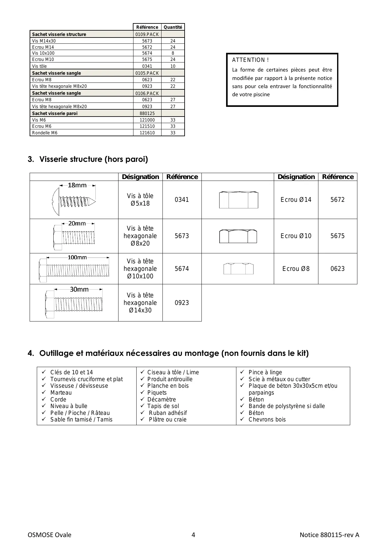 21. Garantie. Sachet visserie sangle 0106.PACK de votre piscine Ecrou M8 0623 27 Vis tête hexagonale M8x20 0923 27 Votre piscine est exclusivement destinée à être posée sur le sol