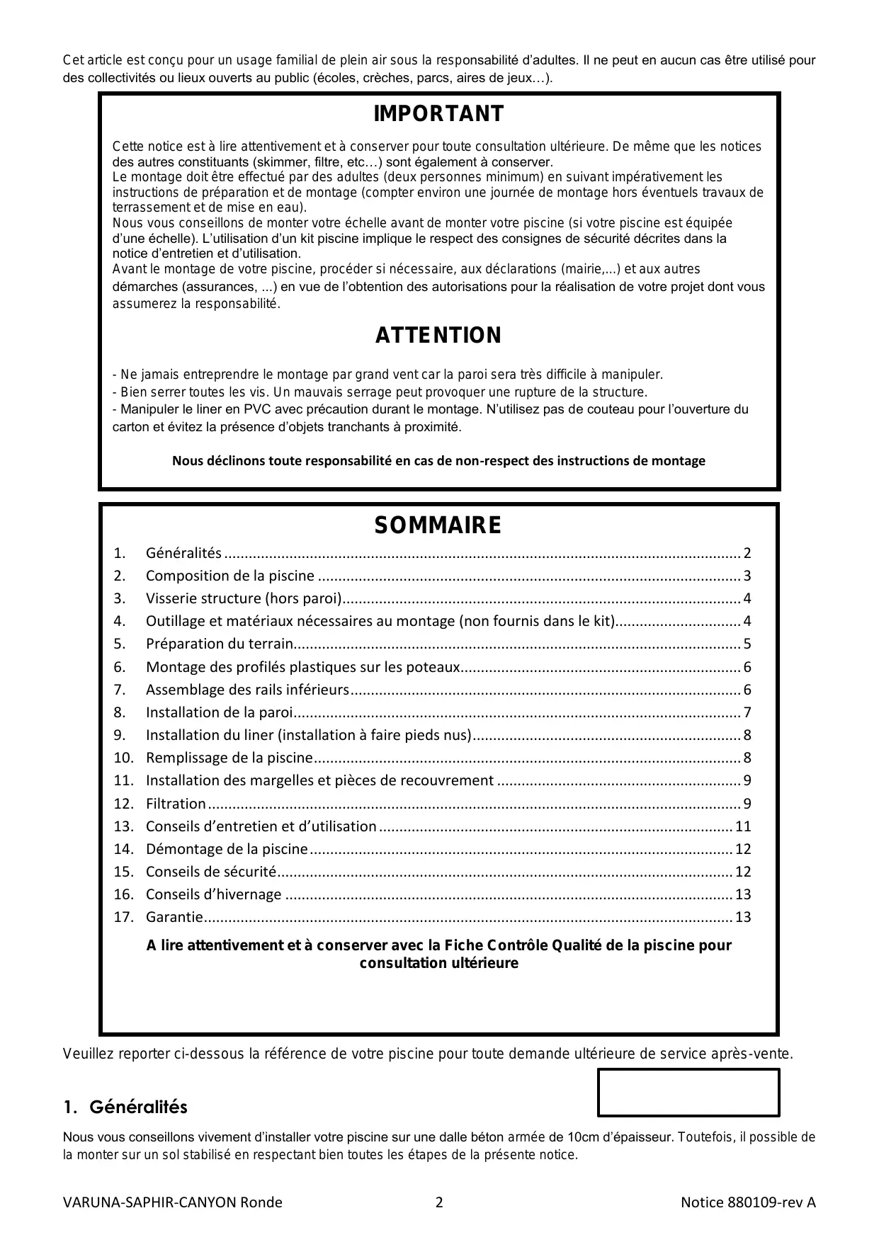 A lire attentivement et à conserver avec la Fiche Contrôle Qualité de la piscine pour consultation ultérieure