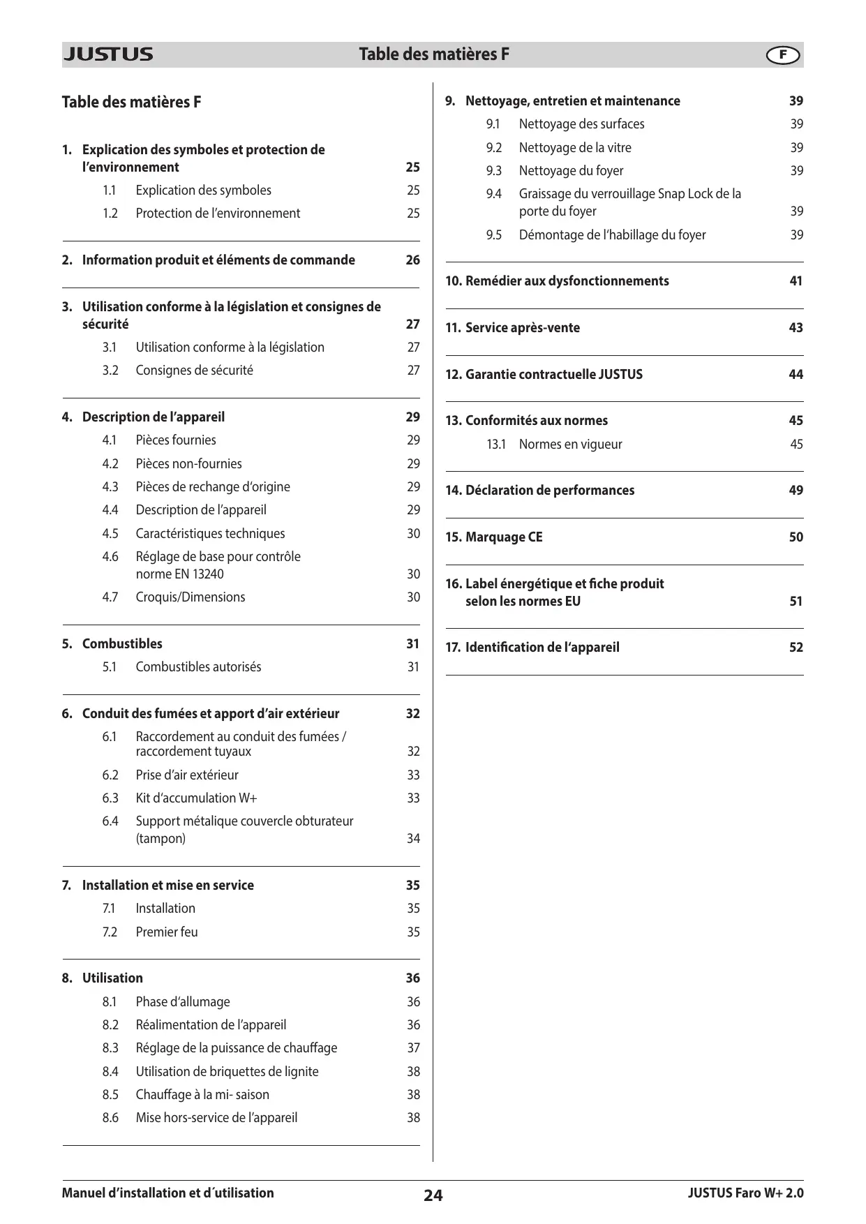 9.5 Démontage de l'habillage du foyer 39 10. Remédier aux dysfonctionnements ai 11. Service après-vente 43 12. Garantie contractuelle JUSTUS 44 13. Conformités aux normes 45 131 Normes en vigueur 45 14. Déclaration de performances 49 15. Marquage CE 50