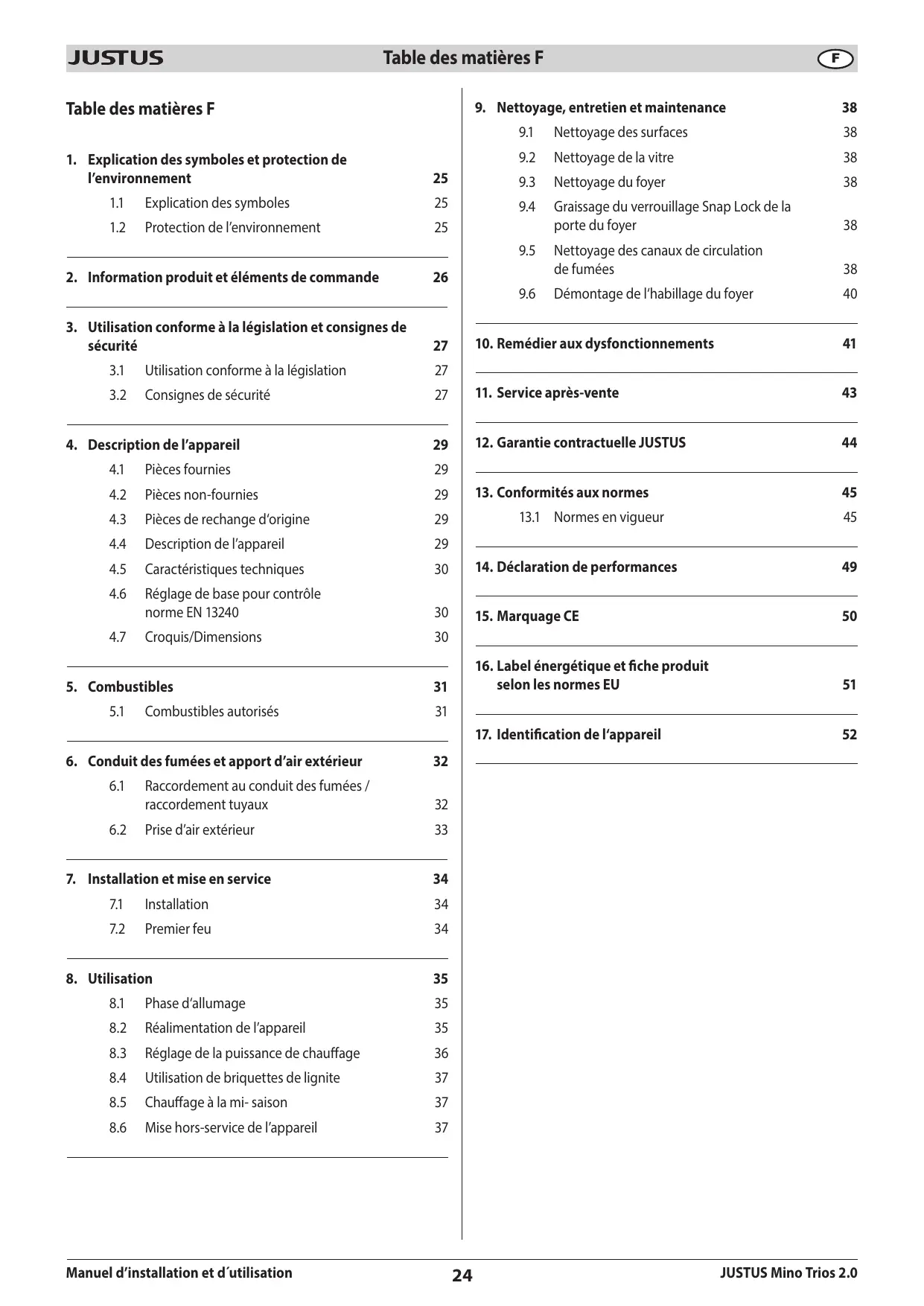 JUSTUS Table des matières F Œ>D Table des matières F 9. Nettoyage, entretien et maintenance 38 91 Nettoyage des surfaces 38 1. Explication des symboles et protection de 9.2 Nettoyage de la vitre 38 l'environnement 25 9.3 Nettoyage du foyer 38 11 Explication des symboles 25 94 Graissage du verrouillage Snap Lock de la 12 Protection de l'environnement 25 porte du foyer 38 9.5 Nettoyage des canaux de circulation 2. Information produit et éléments de commande 26 de fumées 36 9.6 Démontage de l'habillage du foyer 40 3. Utilisation conforme à la législation et consignes de sécurité 27 | 10. Remédier aux dysfonctionnements ai 3.1 Utilisation conforme à la législation 27 3.2 Consignes de sécurité 27 | 11. Service après-vente 43 4. Description de l'appareil 29 | 12. Garantie contractuelle JUSTUS 44 41 Pièces fournies 29 4.2 Pièces non-fournies 29 | 13. Conformités aux normes 45 43 Pièces de rechange d'origine 29 13.1 Normes en vigueur 45 44 Description de l'appareil 29 4.5 Caractéristiques techniques 30 | 14. Déclaration de performances 49 4.6 Réglage de base pour contrôle norme EN 13240 30 | 15. Marquage CE 50 4.7 Croquis/Dimensions 30 16. Label énergétique et fiche produit 5. Combustibles 31 selon les normes EU 51 51 Combustibles autorisés 31 17. Identification de l'appareil 52 6. Conduit des fumées et apport d'air extérieur 32 61 Raccordement au conduit des fumées / raccordement tuyaux 32 62 Prise d'air extérieur 33 7. Installation et mise en service 34 71 Installation 34 7.2 Premier feu 34 8. Utilisation 35 81 Phase d'allumage 35 8.2 Réalimentation de l'appareil 35 8.3 Réglage de la puissance de chauffage 36 84 Utilisation de briquettes de lignite 37 8.5 Chauffage à la mi- saison 37 8.6 Mise hors-service de l'appareil 37