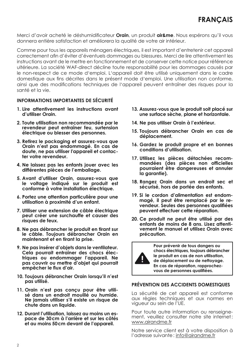 FRANÇAIS Merci d'avoir acheté le déshumidificateur Orain, un produit air&me. Nous espérons qu'il vous donnera entière satisfaction et améliorera la qualité de votre air intérieur.