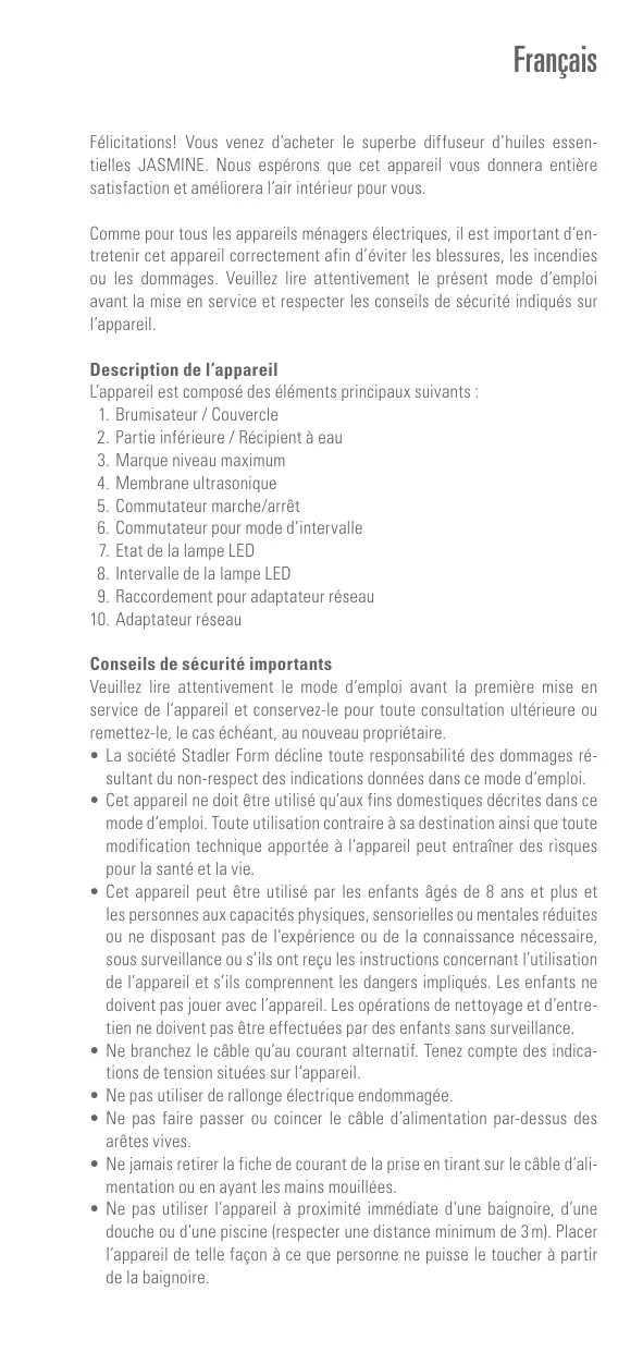 JASMINE TITANIUM - Diffuseur d'huiles essentielles STADLERFORM - Notice d'utilisation et mode d'emploi gratuit