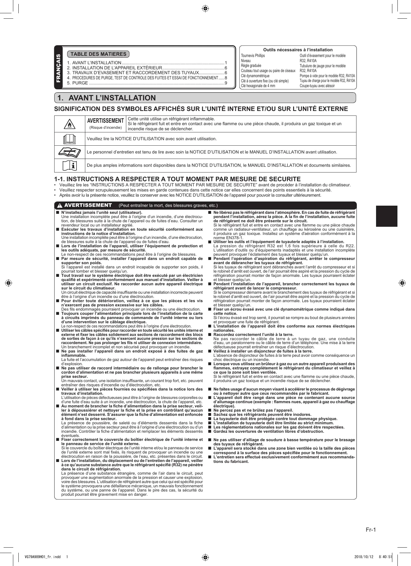 1 Ne libérez pas le réfrigérant dans l'atmosphère. En cas de fuite de réfrigérant pendant l'installation, aérez la pièce. À la fin de l'installation, aucune f de réfrigérant ne doit être présente sur le circui