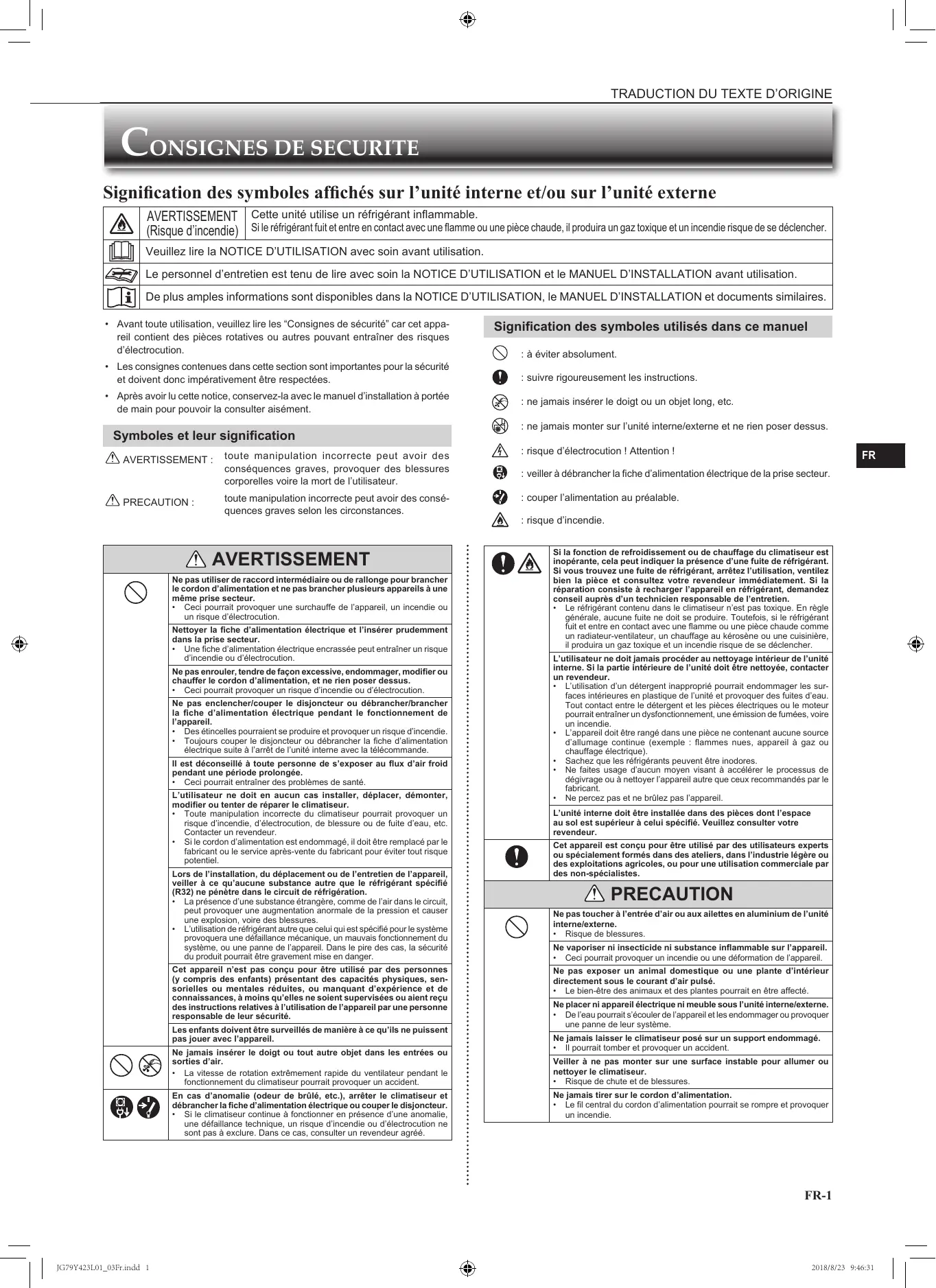 + Toute manipulation incorrecte du climaliseur pourrait provoquer un risque d'incendie, d'électrocution, de blessure ou de fuite d'eau, etc.