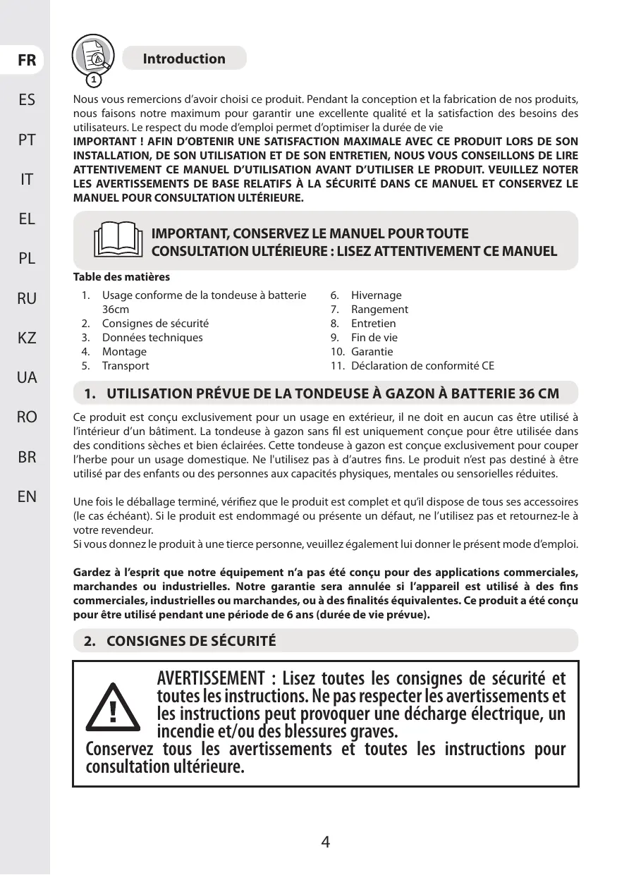 1. Usage conforme de la tondeuse à batterie 6. Hivernage