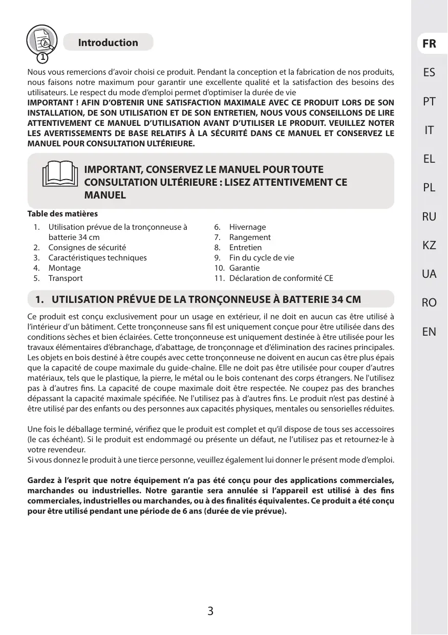 Les objets en bois destiné à être coupés avec cette tronçonneuse ne doivent en aucun cas être plus épais que la capacité de coupe maximale du guide-chaîne. Elle ne doit pas être utilisée pour couper d'autres matériaux, tels que le plastique, la pierre, le métal ou le bois contenant des corps étrangers. Ne l'utilisez pas à d'autres fins. La capacité de coupe maximale doit être respectée. Ne coupez pas des branches dépassant la capacité maximale spécifiée. Ne l'utilisez pas à d'autres fins. Le produit n'est pas destiné à être utilisé par des enfants ou des personnes aux capacités physiques, mentales ou sensorielles réduites.