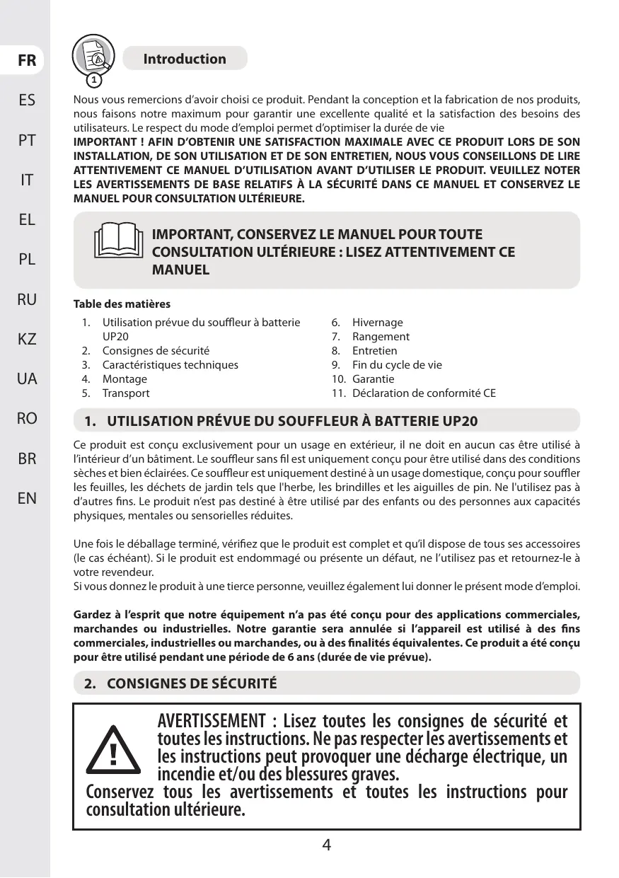 UP20 - 20VBL2-GT.1 - Souffleur de feuilles STERWINS - Notice d'utilisation et mode d'emploi gratuit