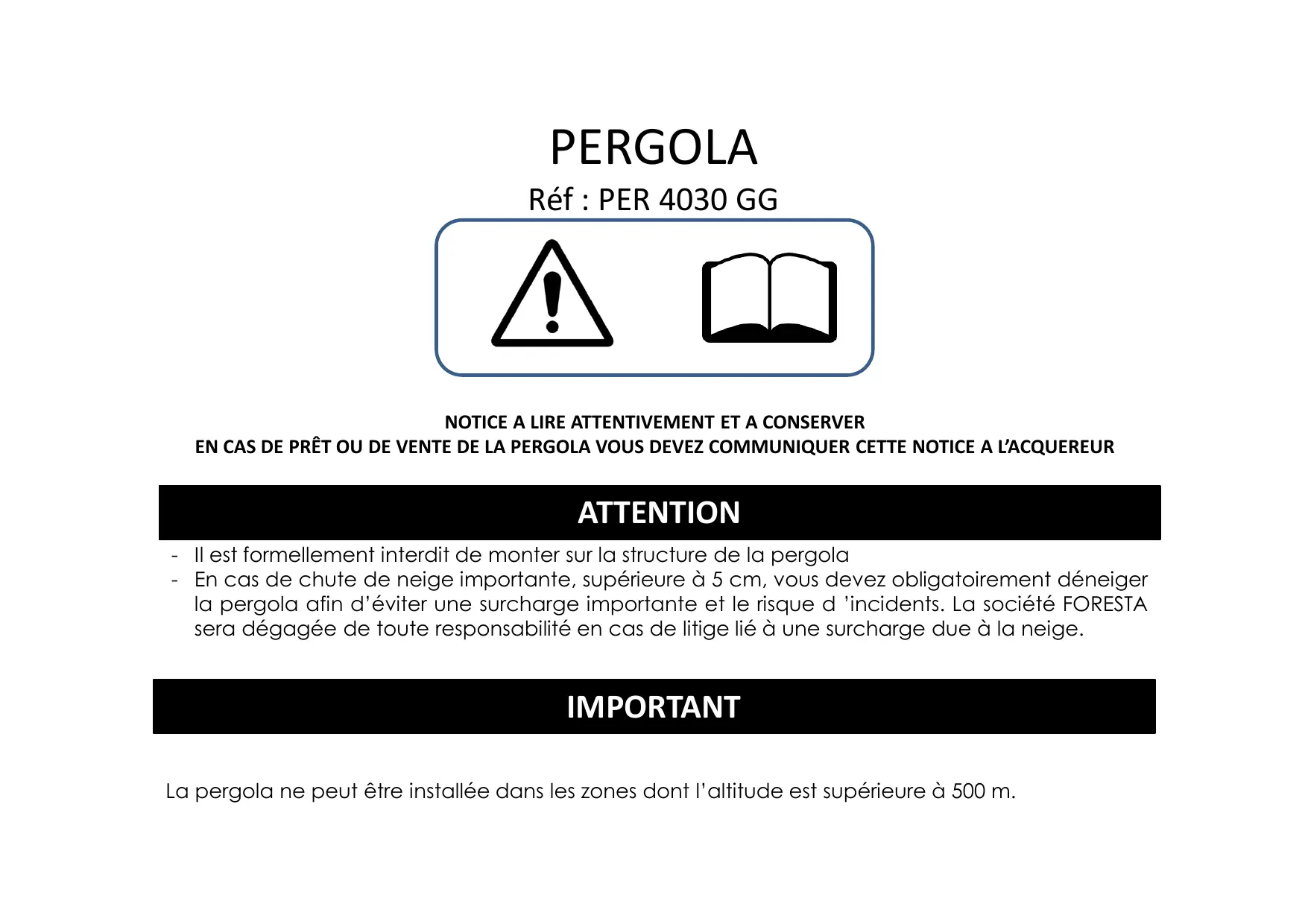 Le fabricant decline toute responsabilité dans les dégats évventuels causés par le non-respect des instructions d'installation du present document, decline toutes responsabilités en cas de modification arbitraire des pieces d'origine. La corrosion des pieces métalliques : sur votre pergola certaines pieces de jonction ou de fixation au sol peuvent être en acier. Nous vous recommendons , en cas de brouillard salin d'entretenir les pieces de votre pergola. Le produit n'est pas garantie contre la corrosion due au vent salin.
