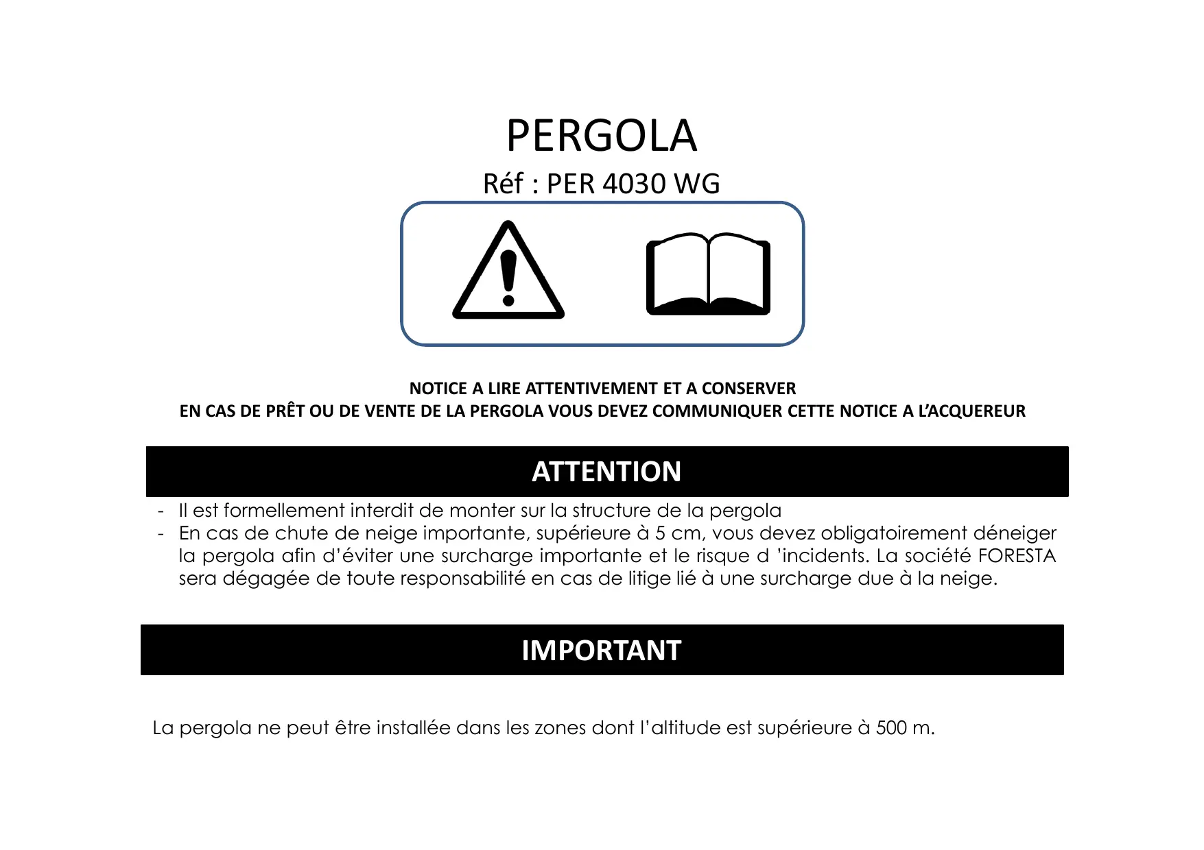 - En cas de chute de neige importante, supérieure à 5 cm, vous devez obligatoirement déneiger la pergola afin d'éviter une surcharge importante et le risque d'incidents. La société FORESTA sera dégagée de toute responsabilité en cas de litige lié à une surcharge due à la neige.