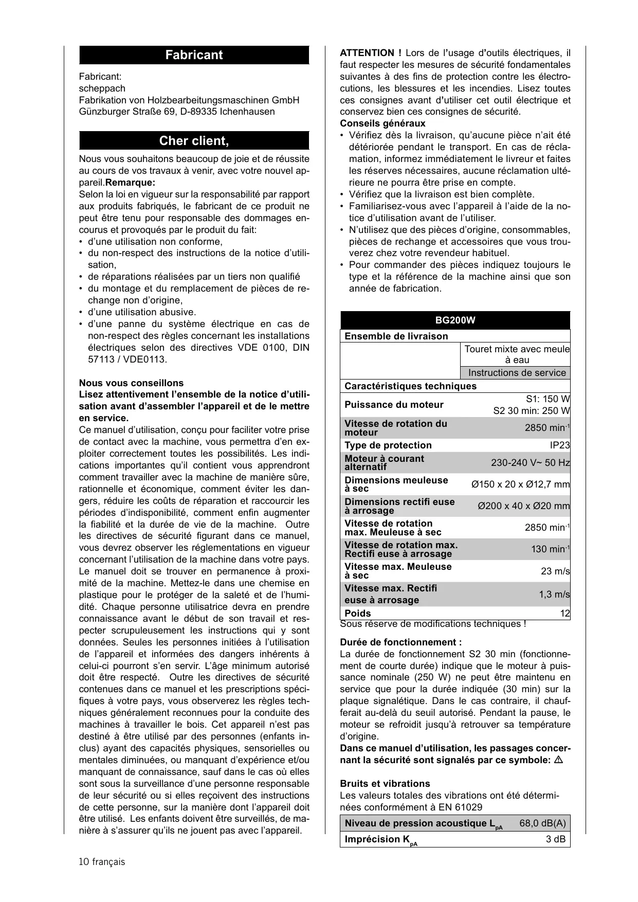 Retrouvez gratuitement la notice de l'appareil BG200W SCHEPPACH au format PDF.