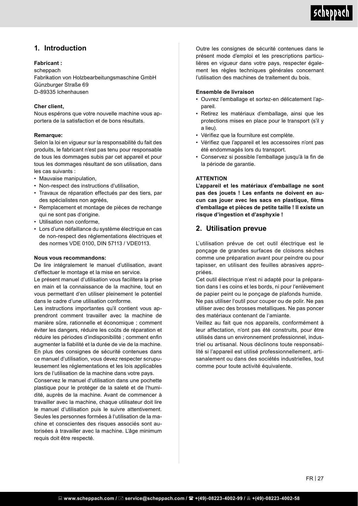 L'utilisation prévue de cet outil électrique est le ponçage de grandes surfaces de cloisons sèches comme une préparation avant pour peindre ou pour tapisser, en utilisant des feuilles abrasives appro- priées. Cet outil électrique n'est ni adapté pour la prépara- tion dans l'es coins et les bords, ni pour l'enlèvement de papier peint ou le ponçage de plafonds humide. Ne pas utiliser l'outil pour couper ou de polir. Ne pas utiliser avec des brosses metalliques. Ne pas poncer des matériaux contenant de l'amiante. Veillez au fait que nos appareils, conformément à leur affectation, n'ont pas été construits, pour être utilisés dans un environnement professionnel, indus- triel ou artisanal. Nous déclinons toute responsabi- lité si l'appareil est utilisé professionnellement, arti- sanalement ou dans des sociétés industrielles, tout comme pour toute activité équivalente. FRI27 www.scheppach.com / [= service@scheppach.com / & +(4