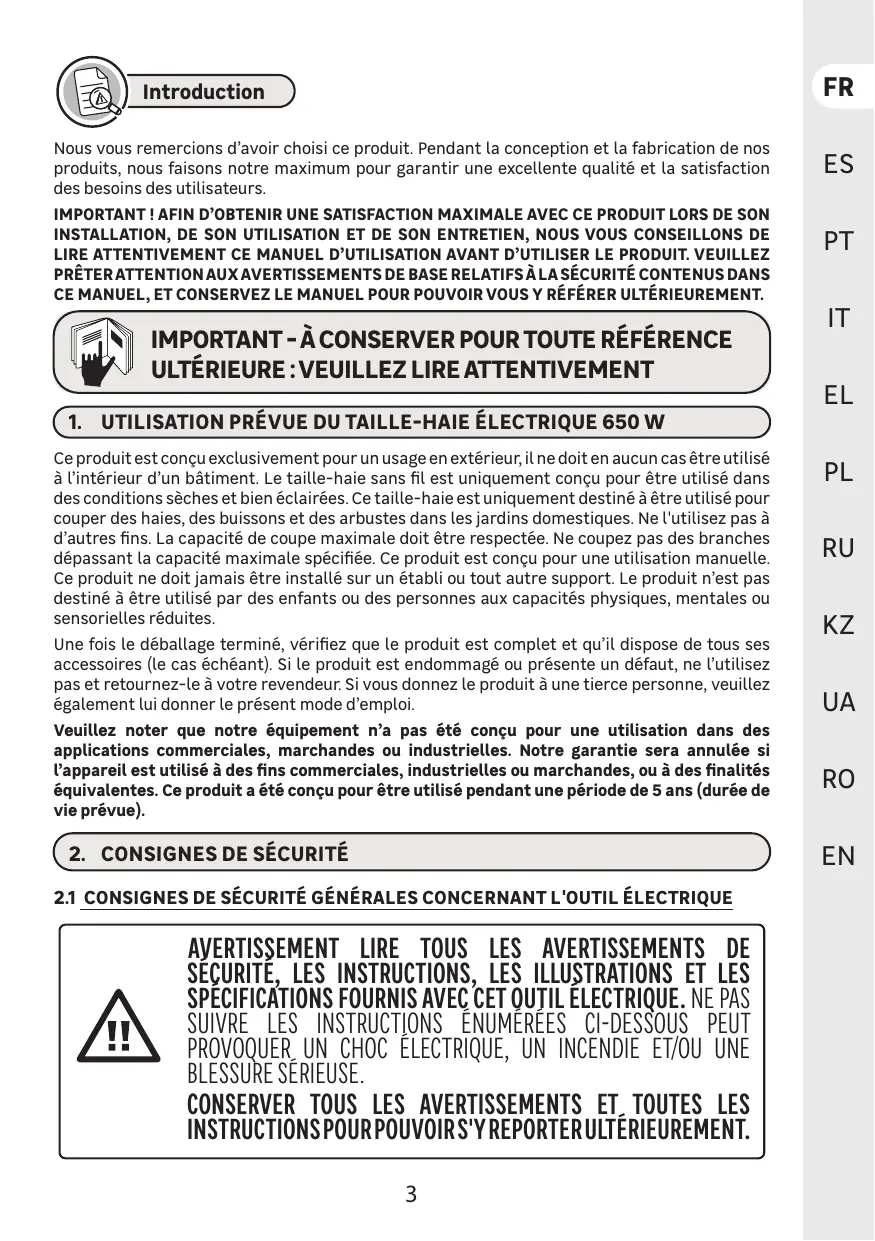 (€ UTILISATION PRÉVUE DU TAILLE-HAIE ÉLECTRIQUE 650 W )