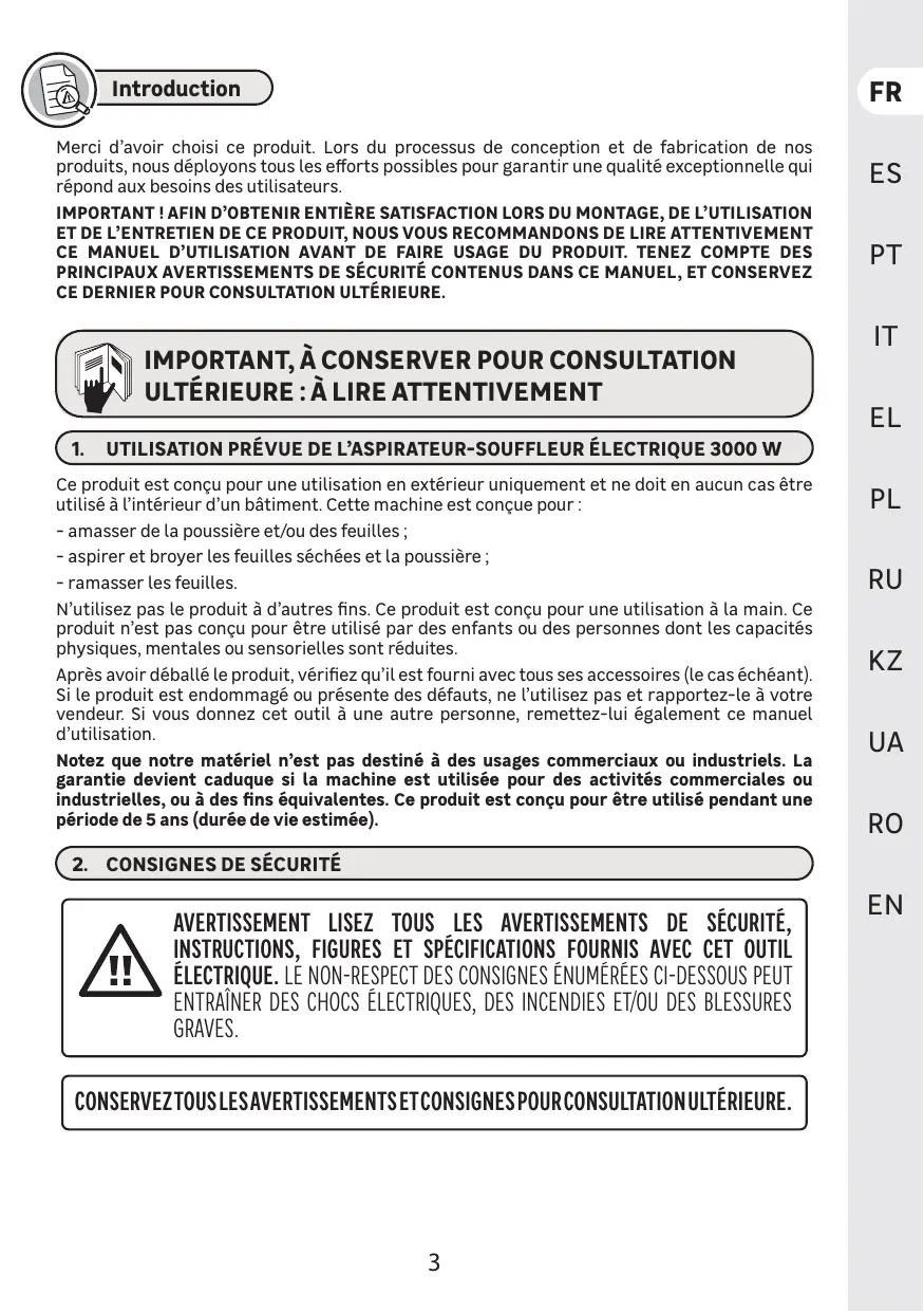 ( IMPORTANT, À CONSERVER POUR CONSULTATION ULTÉRIEURE : À LIRE ATTENTIVEMENT G. UTILISATION PRÉVUE DE L’ASPIRATEUR-SOUFFLEUR ÉLECTRIQUE 3000 W )