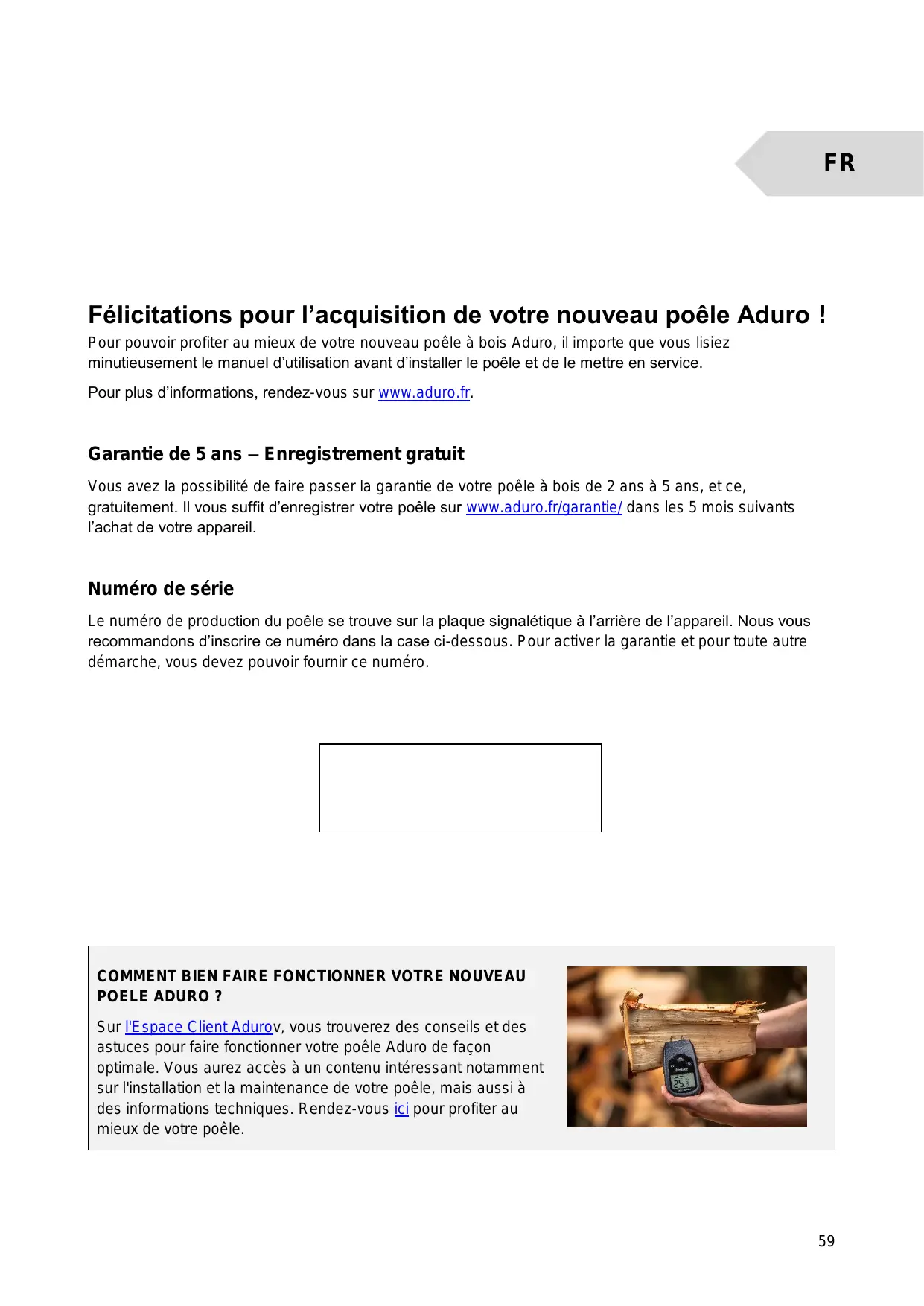 Félicitations pour l’acquisition de votre nouveau poêle Aduro ! Pour pouvoir profiter au mieux de votre nouveau poêle à bois Aduro, il importe que vous lisiez minutieusement le manuel d'utilisation avant d'installer le poêle et de le mettre en service. Pour plus d'informations, rendez-vous sur www.aduro.fr. Garantie de 5 ans -— Enregistrement gratuit Vous avez la possibilité de faire passer la garantie de votre poêle à bois de 2 ans à 5 ans, etce, gratuitement. Il vous suffit d'enregistrer votre poêle sur www.aduro.fr/garantie/ dans les 5 mois suivants l'achat de votre appareil. Numéro de série Le numéro de production du poêle se trouve sur la plaque signalétique à l'arrière de l'appareil. Nous vous recommandons d'inscrire ce numéro dans la case ci-dessous. Pour activer la garantie et pour toute autre démarche, vous devez pouvoir fournir ce numéro.