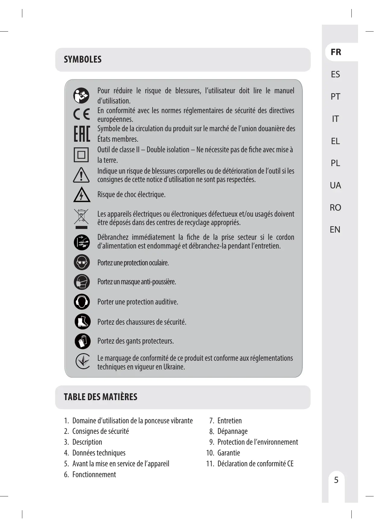 1. Domaine d'utilisation de la ponceuse vibrante 7. Entretien