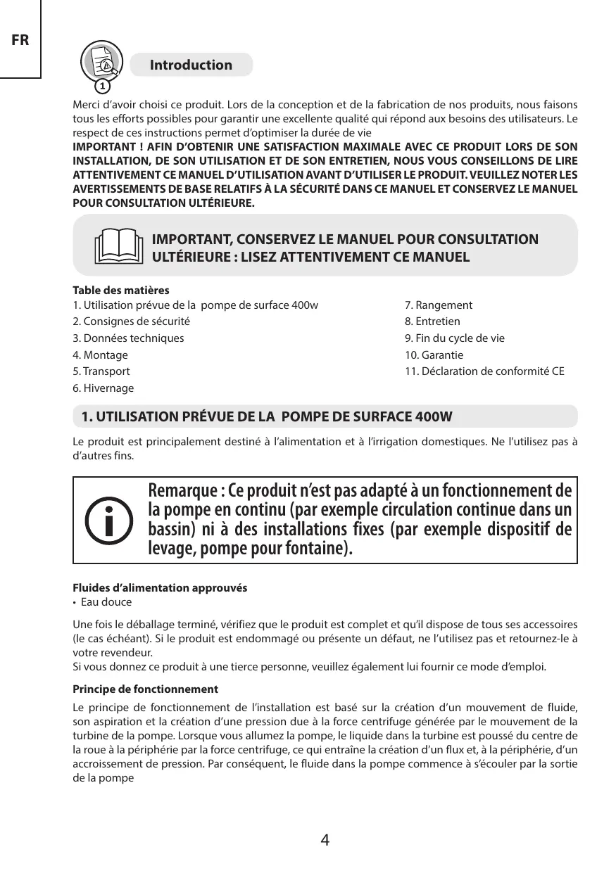 + La pompe n'est pas destinée à être utilisée dans une piscine, elle doit être installée et utilisée conformément aux prindpes d'installation NFC15-100. Consultez votre électricien professionnel pour obtenir des conseils supplémentaires.