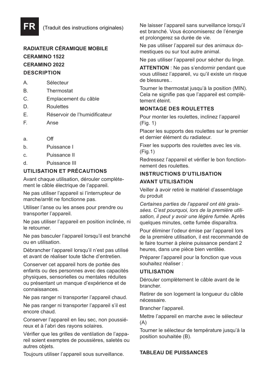 CERAMINO 1522 CERAMINO 2022 DESCRIPTION Sélecteur Thermostat Emplacement du câble Roulettes Réservoir de l'humidificateur nmoow>x Anse a off b. Puissance | c Puissance I d. Puissance Il