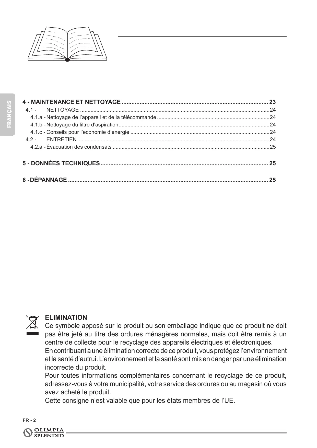 3.3.b -Remplacement des piles … 3.3.c - Position de la télécommande 34- UTILISATION DE L'APPAREIL. 3.4.a- Opérations préliminaires …. 3.4.b - Allumer / éteindre l'appareil... 3.5- MODE DE REFROIDISSEMENT (COOL) En contribuant à une élimination correcte de ce produit, vous protégez l'environnement etla santé d'autrui. L'environnement et la santé sont mis en danger par une élimination