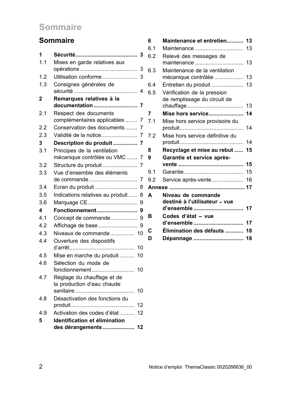 - " Mise hors service provisoire du produit. " Mise hors service définitive du produi Recyclage et mise au rebut mécanique contrôlée ou VMC . 9 Garantie et service après- Structure du produit . 7 vente Vue d'ensemble des éléments 9.1 Garantie de commande … 9.2 Service après-vente. Ecran du produit Annexe Indications relatives au produit A Niveau de commande Marquage CE. destiné à l'utilisateur - vue Fonctionnement d'ensemble Concept de commande B Codes d'état - vue Affichage de base … d'ensemble … Niveaux de commande … C Élimination des défauts D Dépannage … Ouverture des dispositifs d'arrêt. Mise en marche du produit Sélection du mode de fonctionnement Réglage du chauffage et de la production d'eau chaude sanitaire Désactivation des fonctions du produit p. 12
