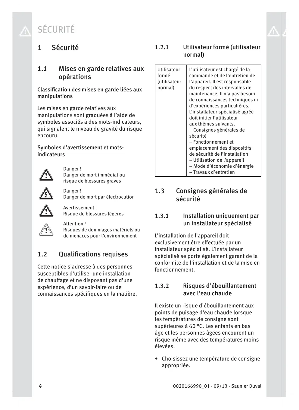 dysfonctionnement + Assurez-vous que l'installation de chauffage se trouve dans un état techniquement irréprochable. + Assurez-vous qu'aucun dispositif de sécurité et de surveillance ne soit retiré, court-cireuité ou mis hors fonction. 0020166990_01 - 09/13 - Saunier Duval + Remédiez immédiatement à tous Les défauts et dommages compromettant la sécurité.
