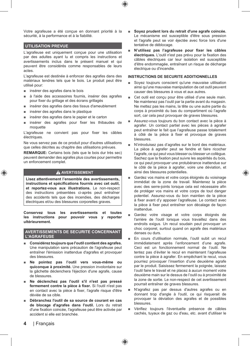= Débranchez l'outil de sa source de courant en cas de blocage d'agrafes dans l'outil. Lors du retrait d'une fixation coincée, l'agrafeuse peut être activée par accident si elle est branchée.