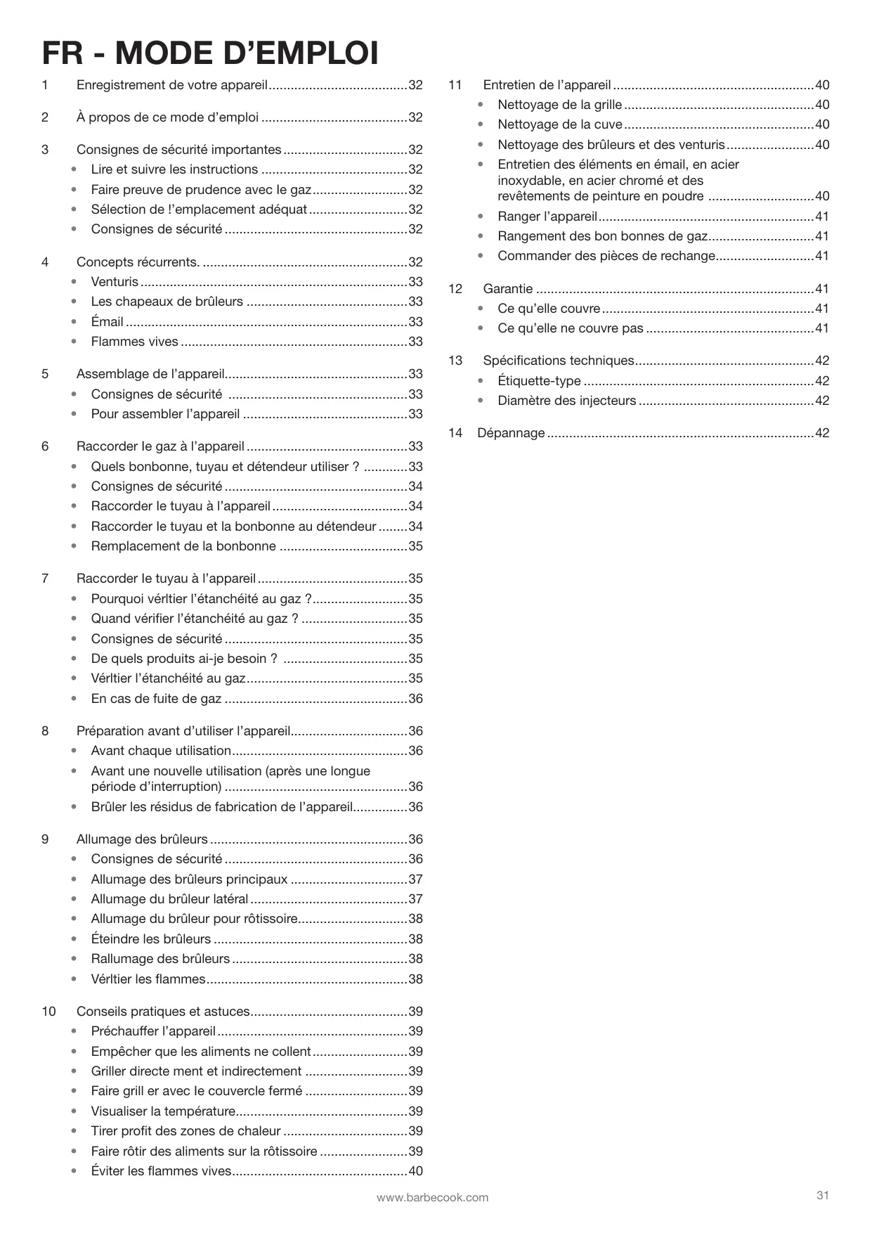 1... Cherchez le numéro de référence de la pièce dont vous avez besoin. Vous trouverez une liste avec tous les numéros de référence sous les vues éclatées dans la deuxième partie de ce mode d'emploi mais également sur www.barbecook. com.