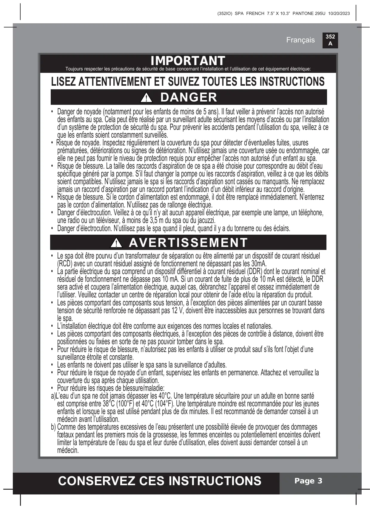 Français ‘} IMPORTANT d joncemant l'installation et l'utilisation de cet équipement électrique: LISEZ ATTENTIVEMENT ET SUIVEZ TOUTES LES INSTRUCTIONS À DANGER + Danger de noyade (notamment pour les enfants de moins de 5 ans). Il faut veiller à prévenir l'accès non autorisé des enfants au spa. Cela peut être réalisé par un surveillant adulte sécurisant les nos d'accès ou par l'installation d'un système de protection de sécurité du spa. Pour prévenir les accidents pendant l'utilisation du spa, veillez à ce ge les enfants soient constamment surveillés. | + Risque de noyade. Inspectez régulièrement la couverture du spa pour détecter d'éventuelles fuites, usures prématurées, détériorations ou Signes de détérioration. N'utilisez Jamais une couverture usée ou endommagée, car elle ne peut pas fournir le niveau de protection requis pour empêcher l'accès non autorisé d'un enfant au spa. +_ Risque de blessure. La taille des raccords d'aspiration de ce spa a été choisie pour correspondre au débit d'eau spécifique généré par la pompe. S'il faut changer la pompe ou les raccords d'aspiration, veillez à ce que les débits soient compatibles. N'utilisez jamais le spa si les raccords d'aspiration sont cassés ou manquants. Ne remplacez gras un raccord d'aspiration par un raccord portant l'indication d'un débit inférieur au raccord d'origine. Û “que de blessure. Si le cordon d'alimentation est endommagé, il doit être remplacé immédiatement. N'enterrez as le cordon d'alimentation. N'uflisez pas de rallonge électrique. + Danger d'électrocution. Veillez à ce qu n'y ait aucun appareil électrique, par exemple une lampe, un téléphone, une radio ou un téléviseur, à moins de 3,5 m du spa ou du jacuzzi. + Danger d'électrocution. N'utlisez pas le spa quand il pleut, quand il y a du tonnerre ou des éclairs. À AVERTISSEMEN Le spa doit être pourvu d'un transformateur de séparation ou être alimenté par un dispositif de courant résiduel fie ) avec un courant résiduel assigné de fonctionnement ne dépassant pas les 30mA. | a partie électrique du spa comprend un dispositif différentiel à courant résiduel (DDR) dont le courant nominal et résiduel de fonctionnement ne dépasse pas 10 mA. Si un courant de fuite de plus de 10 mA est détecté, le DDR sera activé et coupera l'alimentation électrique, auquel cas, débranchez l'appareil et cessez immédiatement de l'utiliser. Veuillez contacter un centre de réparation local pou Obtenir de l'aide et/ou la réparation du produit. Les pièces comportant des composants sous tension, à l'exception des pièces alimentées par un courant basse Eerson de sécurité renforcée ne dépassant pas 12 V, doivent être inaccessibles aux personnes se trouvant dans le spa. L'installation électrique doit être conforme aux exigences des normes locales et nationales. Les pièces comportant des composants électriques, à l'exception des pièces de contrôle à distance, doivent être pos jonnées ou fixées en sorte de ne pas pouvoir tomber dans le spa. | | | our réduire le risque de blessure, n'autorisez pas les enfants à utiliser ce produit sauf s'ils font l'objet d'une surveillance étroite et constante. Les enfants ne doivent pas utiliser le spa sans la surveillance d'adultes. Pour réduire le risque de noyade d'un enfant, supervisez les enfants en permanence. Aftachez et verrouillez la couverture du spa après chaque utilisation. Pour réduire les risques de blessure/maladie: a)]L'eau d'un spa ne doit jamais dépasser les 40°C. Une température sécuritaire pour un adulte en bonne santé est comprise entre 38°C LE 40°C (104°F). Une température moindre est recommandée pour les jeunes enfants et lorsque le pe est utilisé pendant plus de dix minutes. Il est recommandé de demander conseil à un médecin avant l'utilisation. b) Comme des lenpératres excessives de l'eau présentent une possibilité élevée de provoquer des dommages fctaux pendant les premiers mois de la presse, les femmes enceintes ou potentiellement enceintes doivent ii la température de l'eau du spa et leur durée d'utilisation, elles doivent aussi demander conseil à un médecin.
