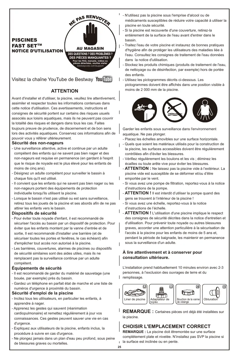 Téléchargez la notice de votre Piscine hors-sol au format PDF gratuitement ! Retrouvez votre notice FAST SET - BESTWAY et reprennez votre appareil électronique en main. Sur cette page sont publiés tous les documents nécessaires à l'utilisation de votre appareil FAST SET de la marque BESTWAY.