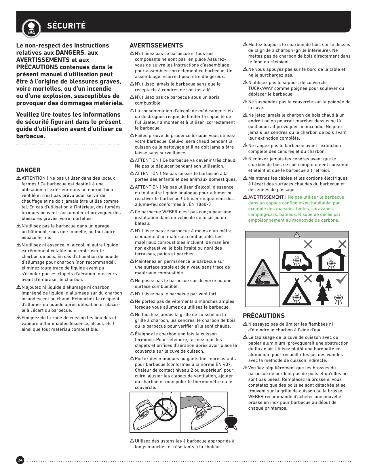 A AVERTISSEMENT ! Ne pas utiliser Le barbecue dans un espace confinè et/ou habitable, par exemple des maisons, tentes, caravanes, camping-cars, bateaux. Risque de décès par empoisonnement au monoxyde de carbone.