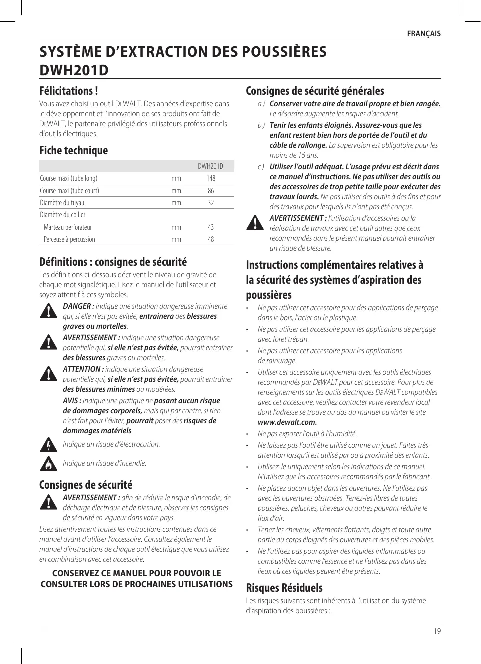 À AVERTISSEMENT : du fait que les accessoires, autres que ceux proposés par DEWALT, n'ont pas été testés avec ce produit, leur utilisation avec ce produit pourrait être dangereuse. Pour réduire tout risque de dommages corporels, seuls des accessoires DEWALT recommandés doivent être utilisés avec cet appareil