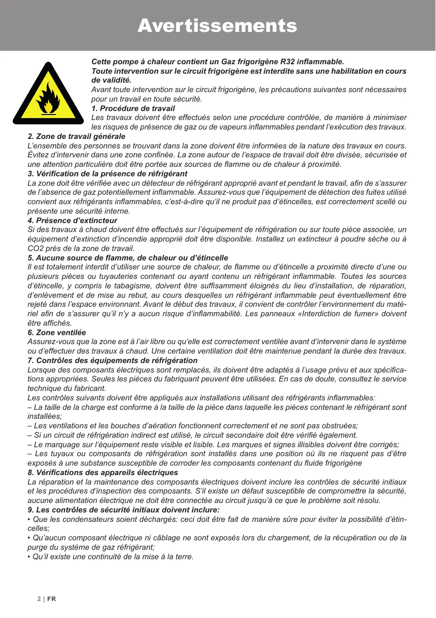 Il est totalement interdit d'utiliser une source de chaleur, de flamme ou d'étincelle a proximité directe d'une ou plusieurs pièces ou tuyauteries contenant ou ayant contenu un réfrigérant inflammable. Toutes les sources d'étincelle, y compris le tabagisme, doivent être suffisamment éloignés du lieu d'installation, de réparation, d'enlèvement et de mise au rebut, au cours desquelles un réfrigérant inflammable peut éventuellement être rejeté dans l'espace environnant. Avant le début des travaux, il convient de contrôler l'environnement du maté- riel afn de s'assurer qu'il n'y a aucun risque d'inflammabilité. Les panneaux «interdiction de fumer» doivent